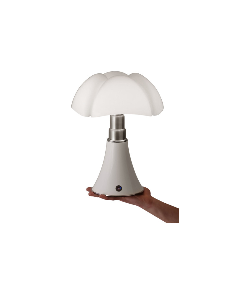 Une version mini de la lampe Pipistrello dessinée par Gae Aulenti en 1965. Lampe de table à lumière diffuse. Télescope en acier inox satiné. Diffuseur en méthacrylate opal blanc. Structure et pommeau en aluminium peint. Source de lumière à LED, dimmable. Driver électronique sur la prise.