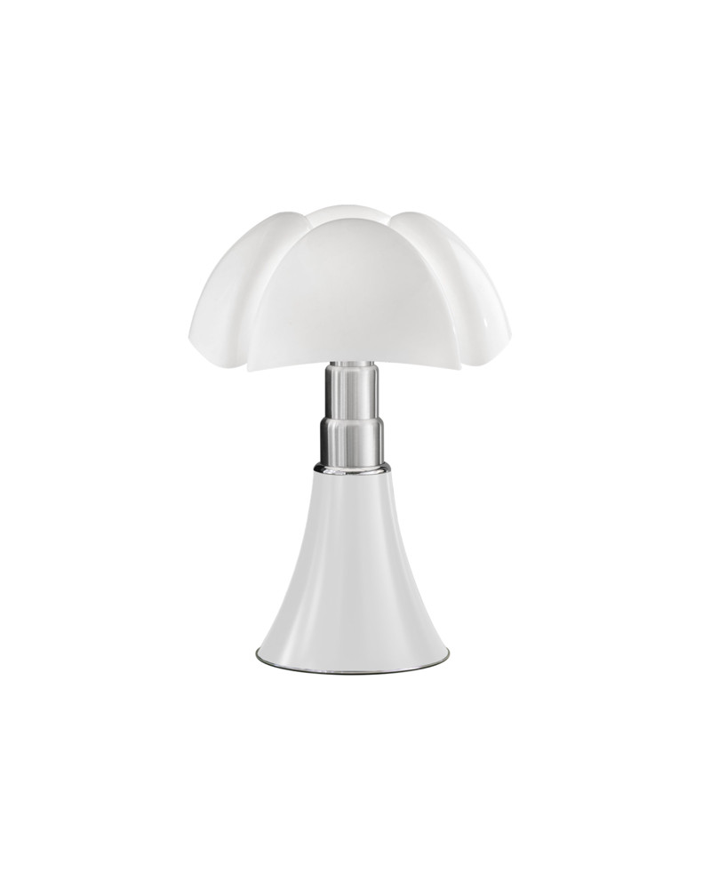 Le diffuseur de cette lampe, dessinée en 1965 par Gae Aulenti pour Martinelli Luce a été réalisée au moyen de techniques de moulage innovantes à l'époque. La forme de la base évasée se développe en hauteur en s'élargissant au niveau des nervures du diffuseur comme les ailes d'une chauve-souris. La lampe, installée sur une table ou bien au sol, exprime toute sa personnalité, dans n'importe quel environnement.