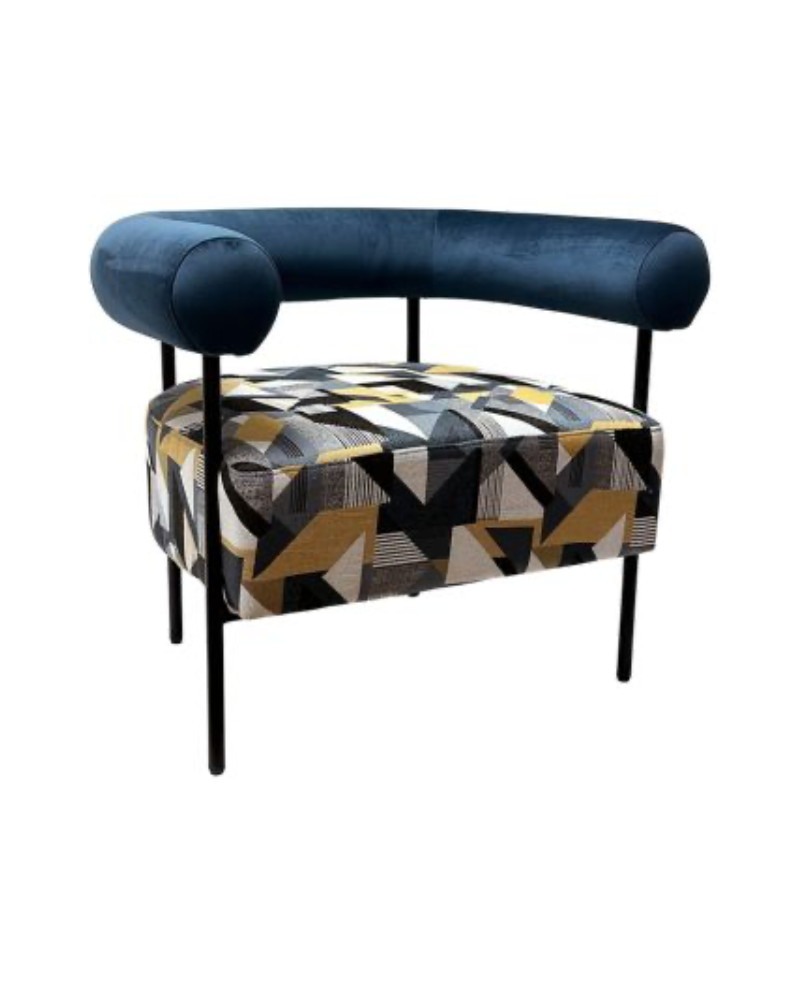 Ce fauteuil dans les tons bleu, jaune et gris est très moderne avec ses formes géométriques.