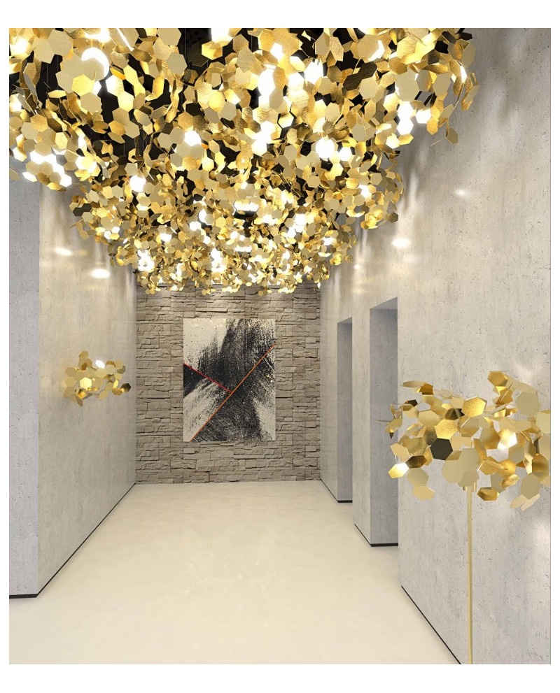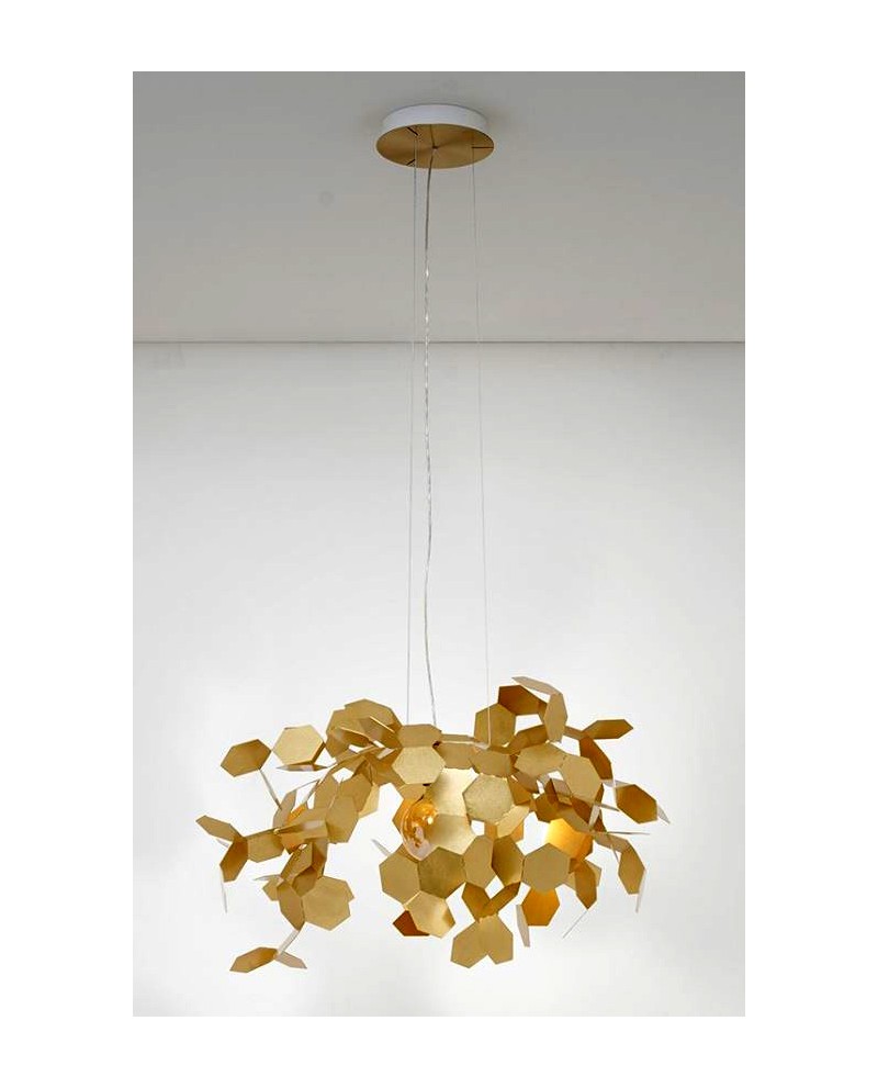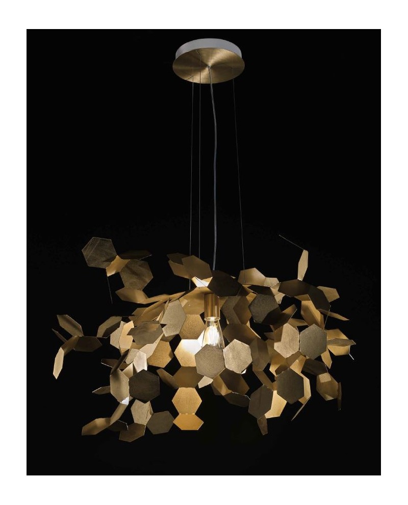 Suspension en métal hexagonaux finition laiton brossé. Câblages en acier (réglable en hauteur).