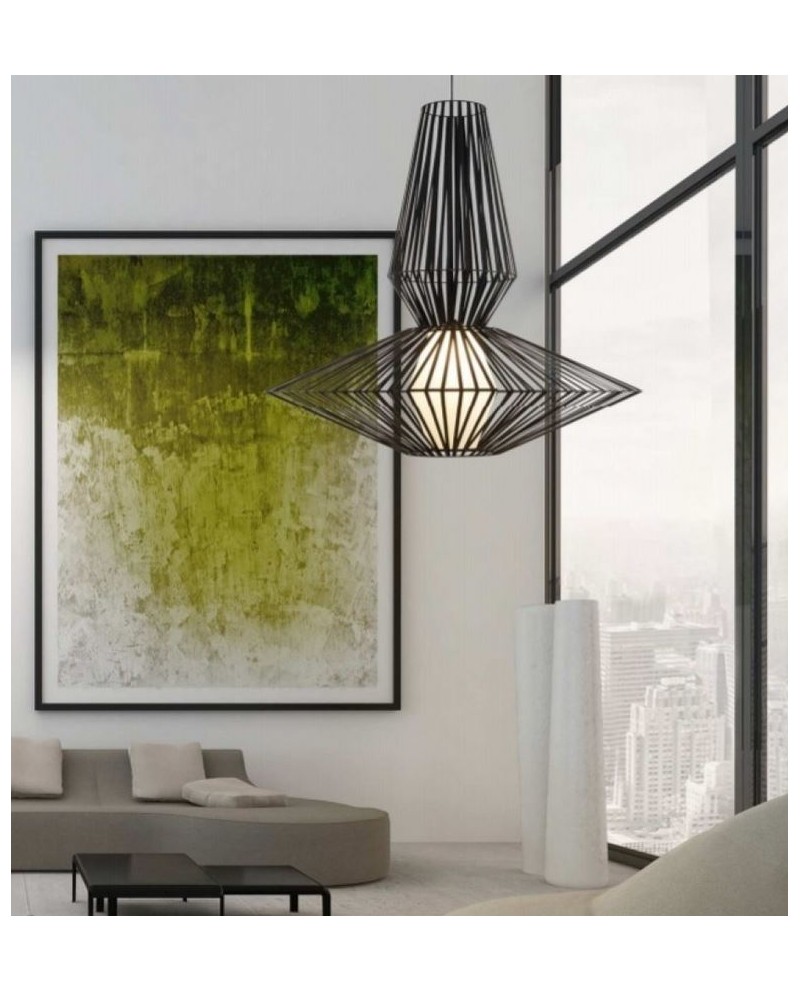 Très belle suspension métal gris anthracite avec ruban noir composite en polypropylène, abat-jour central blanc.