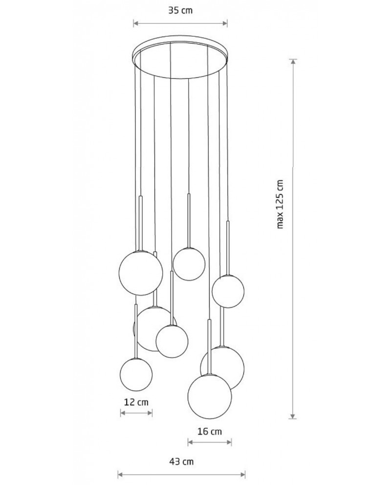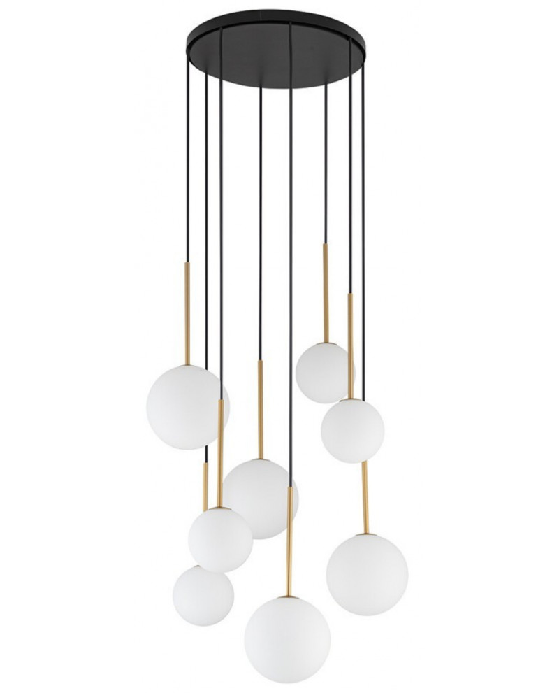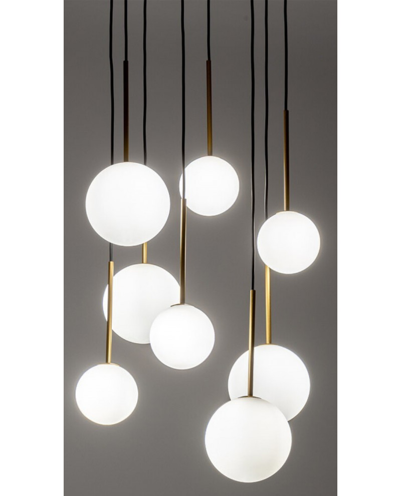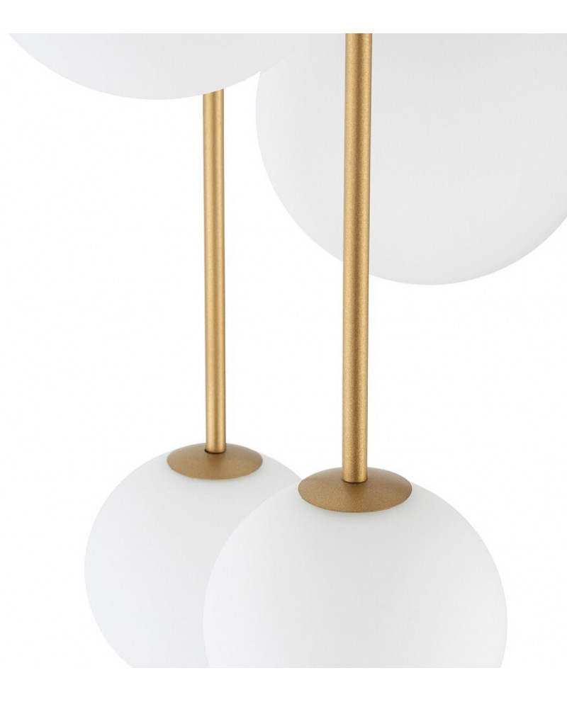 Structure élégante avec des abat-jours sphériques en verre de différentes hauteurs, avec des détails dorés.