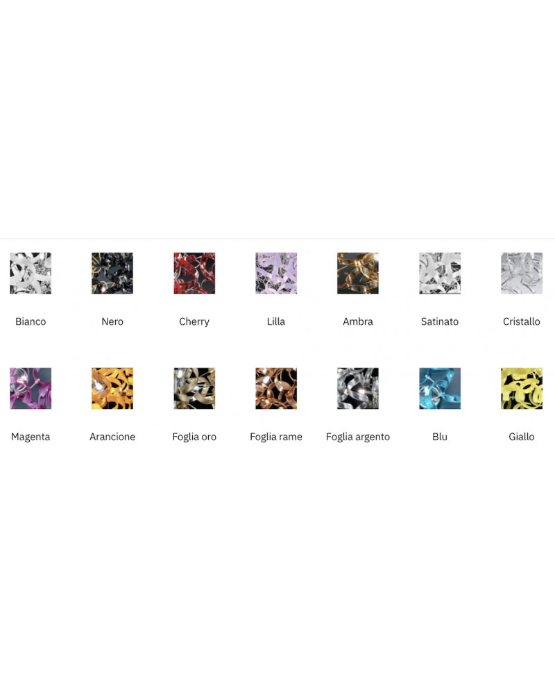 Coloris spirales : Blanc, Noir, Cerise, Lilla, Ambre, Satiné, Transparent, Magenta, Orange, Bleu, Jaune, Feuille d'or, Feuille de cuivre, Feuille d'Argent.