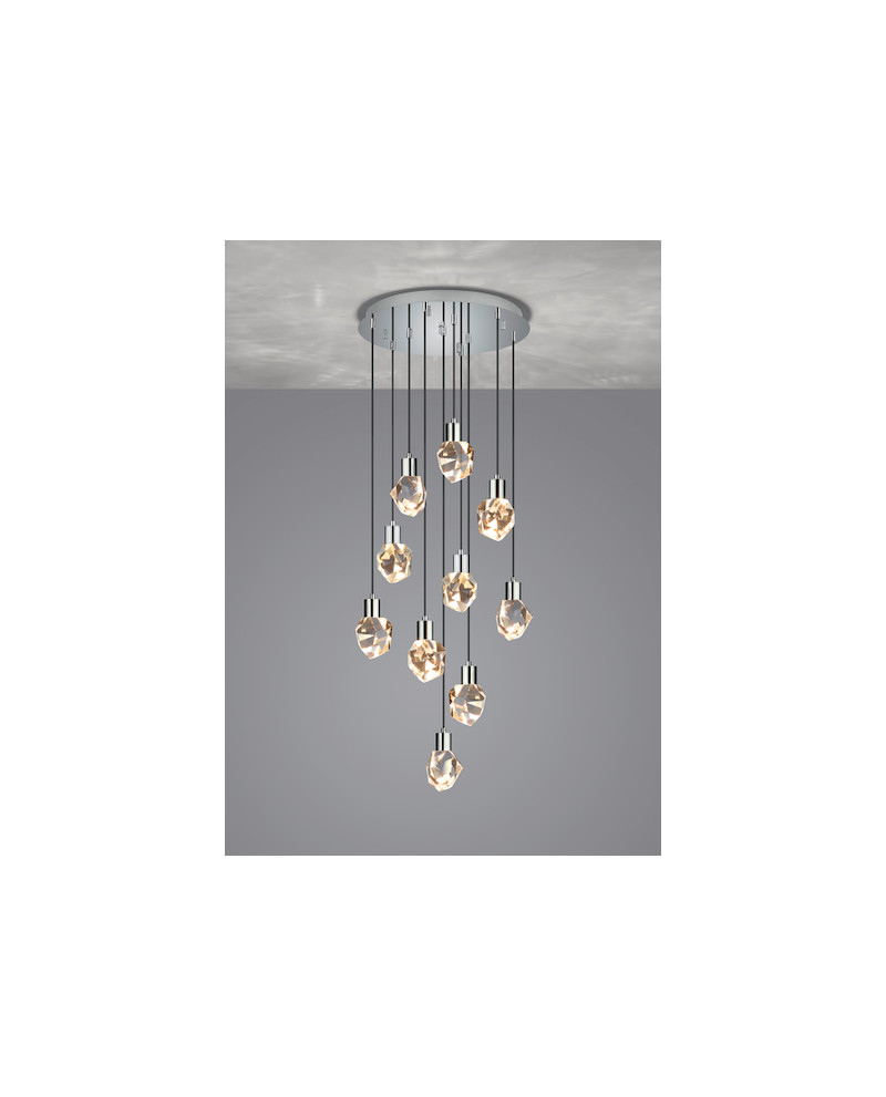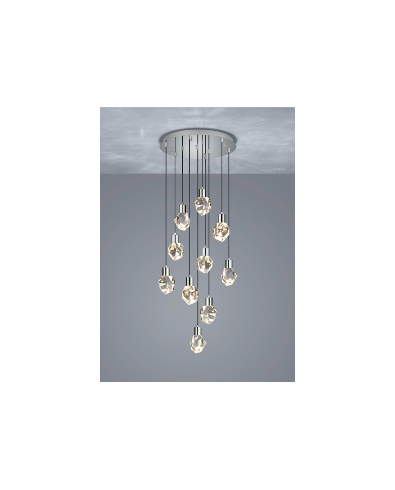 La lampe suspendue VERANO à dix ampoules associe un cristal fin à un métal de haute qualité pour apporter un glamour pur à votre intérieur. Elle crée un impressionnant jeu d'ombres et de lumières qui crée une atmosphère lumineuse de rêve et plonge chaque pièce dans une ambiance atmosphérique. En tant qu'élément décoratif autonome au-dessus d'un comptoir ou d'une table à manger, le VERANO attire tous les regards. La luminosité peut être réglée en trois étapes à l'aide d'un interrupteur, tandis que la couleur de la lumière peut être réglée directement sur le luminaire. Les cristaux transparents et le métal chromé confèrent à la lampe une touche luxueuse et s'intègrent harmonieusement dans tout concept d'habitation moderne. Le luminaire est également équipé de la technologie LED moderne, qui se caractérise par une qualité de lumière élevée et une grande efficacité énergétique. Par rapport aux sources lumineuses halogènes conventionnelles, il est possible d'économiser jusqu'à 80 % des coûts énergétiques. Les sources lumineuses LED ont également une longue durée de vie, produisent moins de chaleur et protègent l'environnement.