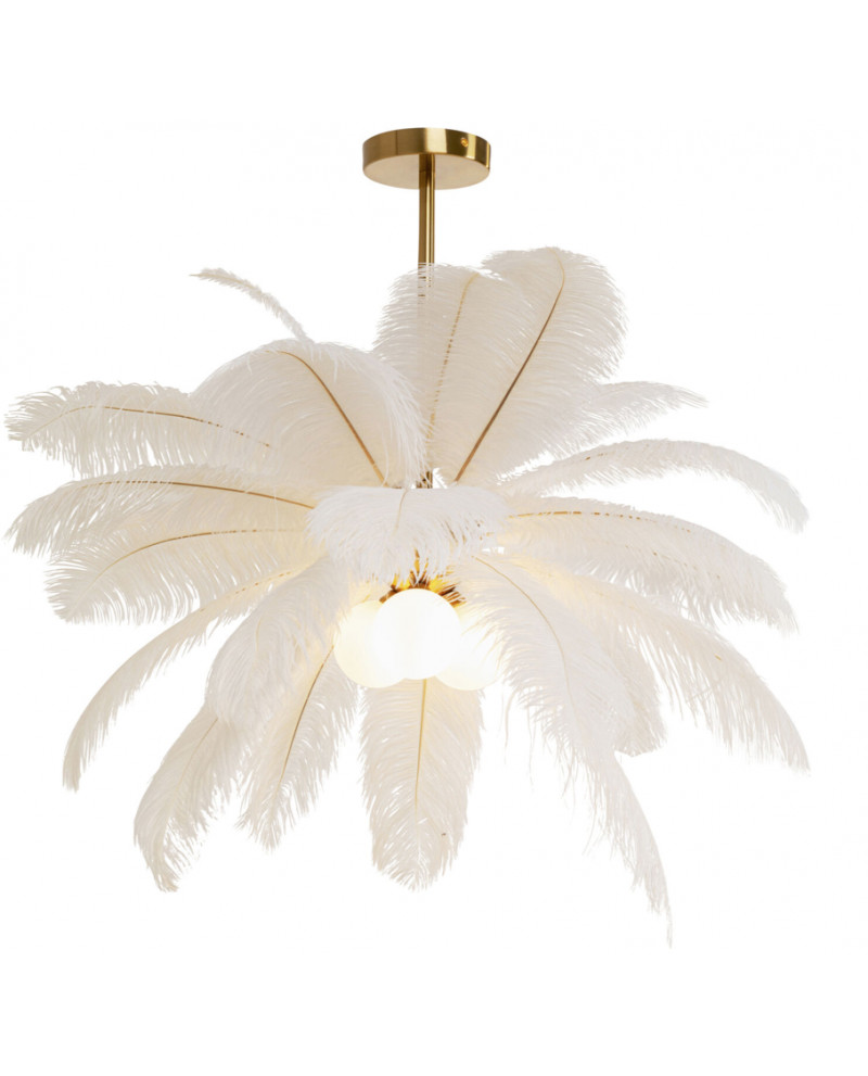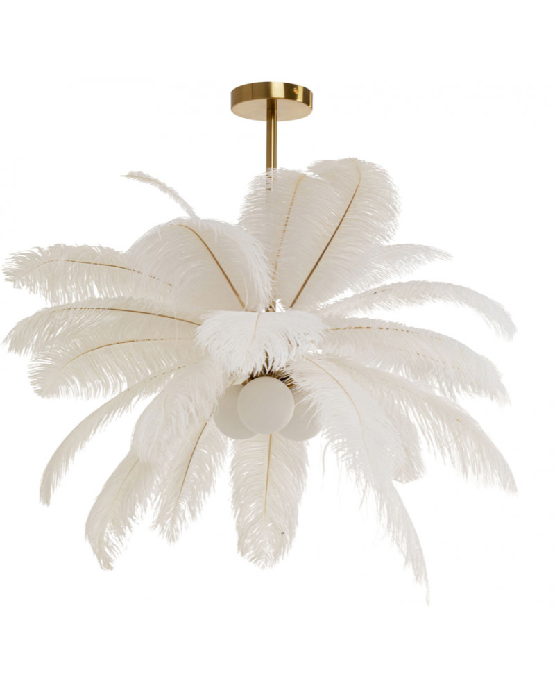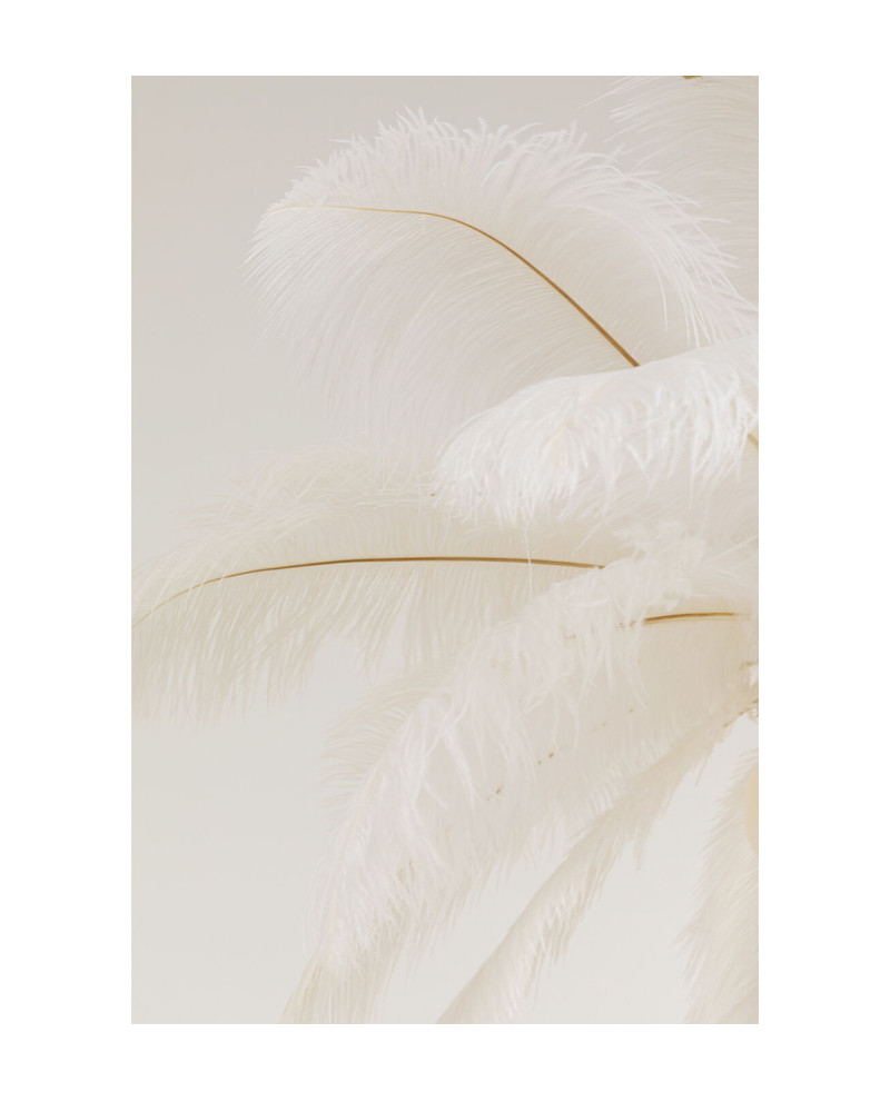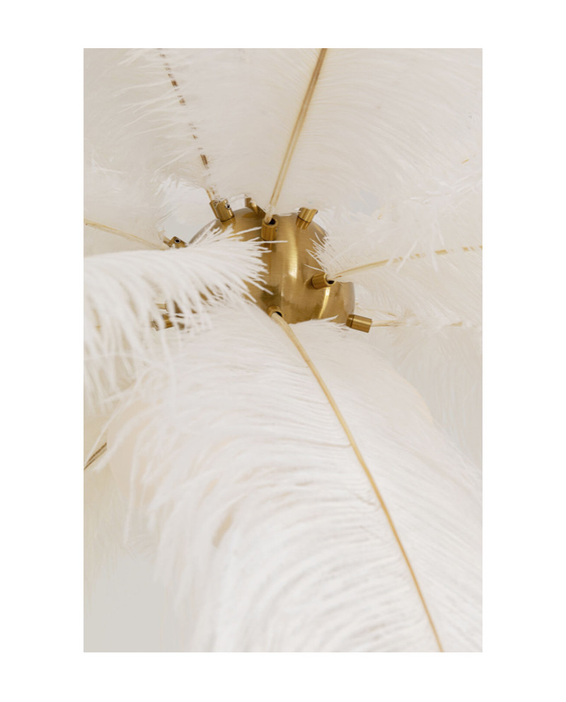 Cette suspension exceptionnelle allie ambiance tropicale et style jungle à une touche de charme glamour. Les véritables plumes d'autruche lui confèrent une touche chaleureuse et expressive, tandis que le baldaquin en laiton doré crée un effet sophistiqué et luxueux. Les plumes, délicatement mouvantes, captent la lumière et créent un fascinant jeu d'ombres. Au-dessus de la table à manger ou comme élément phare dans la chambre, ce luminaire s'intègre avec élégance dans une grande variété de styles de vie et crée une oasis de bien-être.