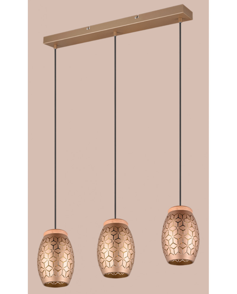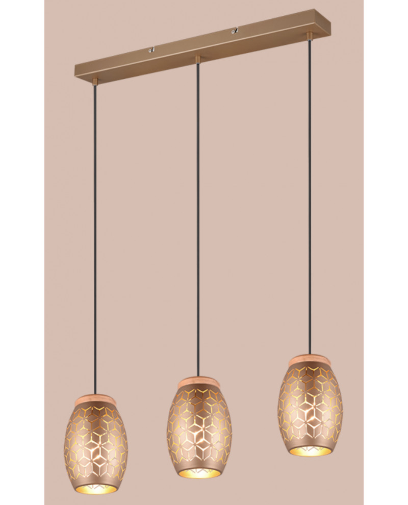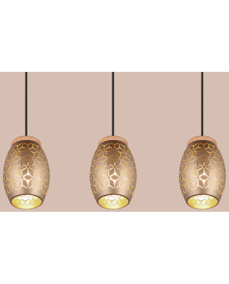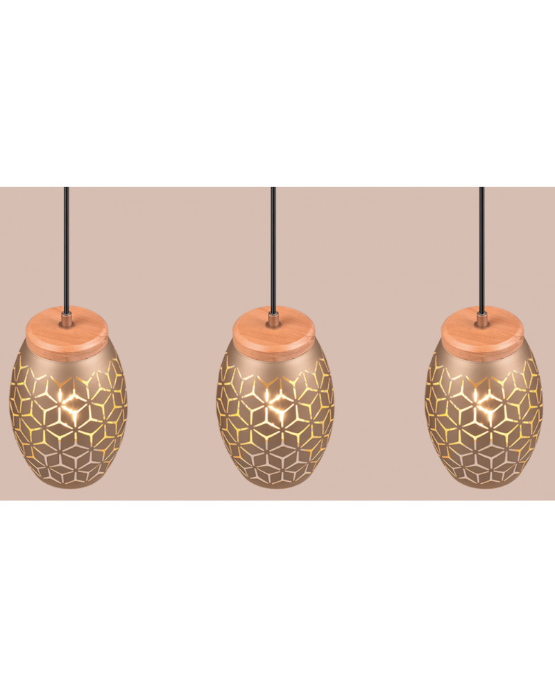 La lampe suspendue BIDAR à trois lumières apporte une lumière particulière et agréable dans votre maison et devient la pièce maîtresse lumineuse de n'importe quelle pièce. La lumière brille doucement à travers les motifs et crée un jeu de lumière unique dans l'environnement. Les accents en bois naturel du luminaire renforcent la sensation de chaleur. Le BIDAR est un véritable atout visuel avec une touche de confort ! Le métal de couleur café et or, les accents de bois naturel et le langage ludique du design créent un élément décoratif passionnant pour vos quatre murs. L'utilisation de sources lumineuses LED est recommandée pour un éclairage économe en énergie. Elles constituent une alternative idéale aux sources lumineuses halogènes conventionnelles et offrent une qualité de lumière élevée tout en permettant des économies d'énergie allant jusqu'à 80 %. Avec les sources lumineuses à LED, vous bénéficiez également d'une longue durée de vie et d'une faible production de chaleur, tout en protégeant l'environnement.