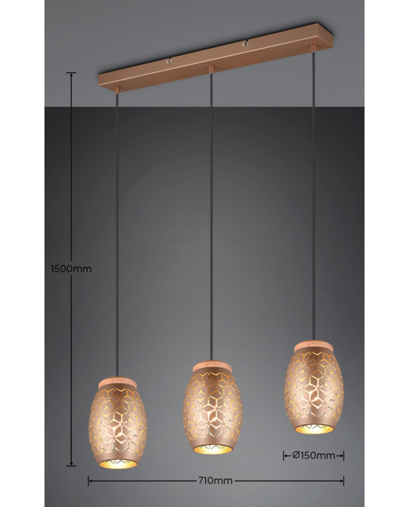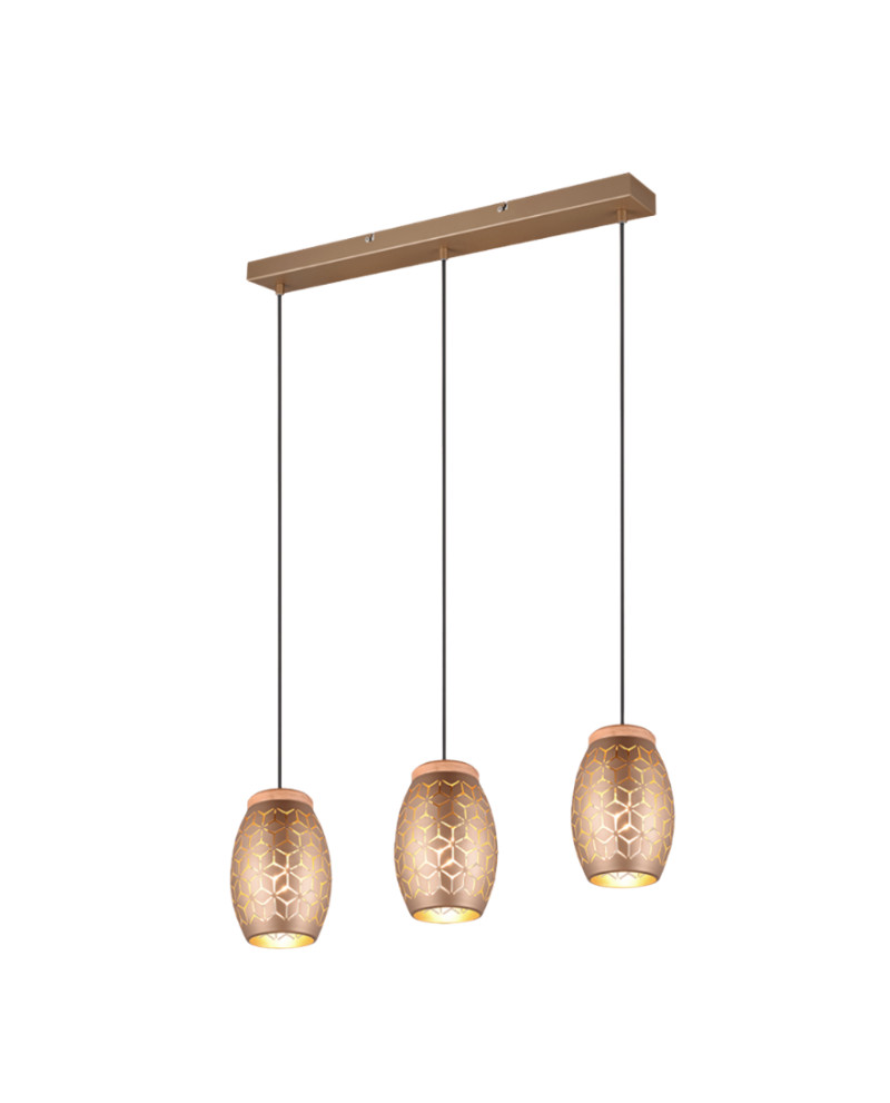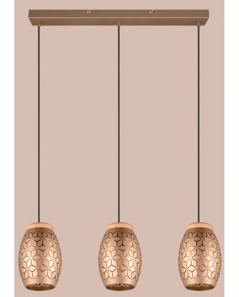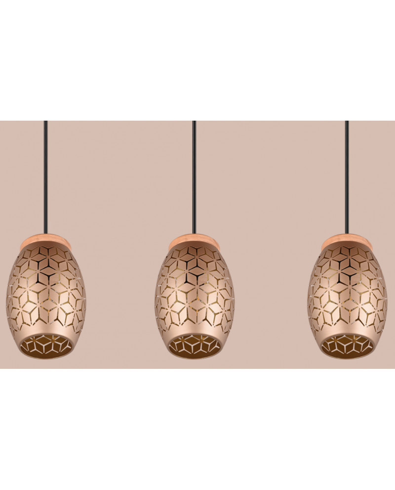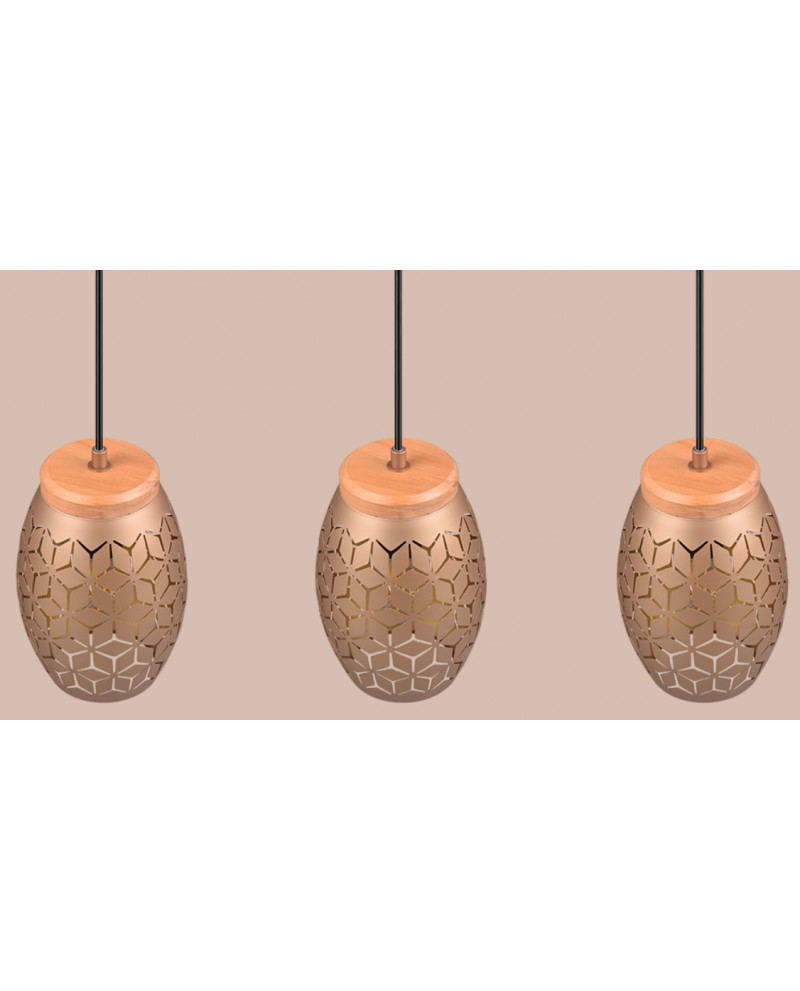 La lampe suspendue BIDAR à trois lumières apporte une lumière particulière et agréable dans votre maison et devient la pièce maîtresse lumineuse de n'importe quelle pièce. La lumière brille doucement à travers les motifs et crée un jeu de lumière unique dans l'environnement. Les accents en bois naturel du luminaire renforcent la sensation de chaleur. Le BIDAR est un véritable atout visuel avec une touche de confort ! Le métal de couleur café et or, les accents de bois naturel et le langage ludique du design créent un élément décoratif passionnant pour vos quatre murs. L'utilisation de sources lumineuses LED est recommandée pour un éclairage économe en énergie. Elles constituent une alternative idéale aux sources lumineuses halogènes conventionnelles et offrent une qualité de lumière élevée tout en permettant des économies d'énergie allant jusqu'à 80 %. Avec les sources lumineuses à LED, vous bénéficiez également d'une longue durée de vie et d'une faible production de chaleur, tout en protégeant l'environnement.