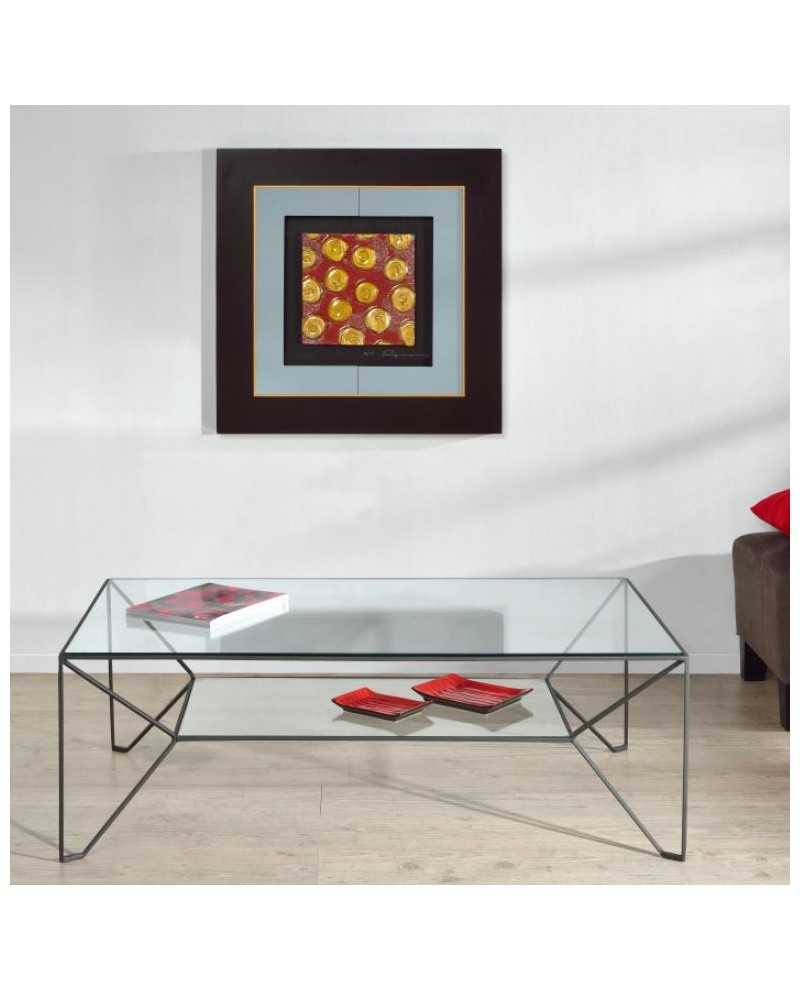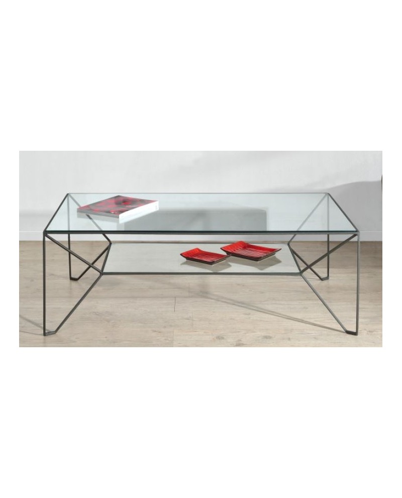 Très belle table de salon épurée en métal gris anthracite, tablette en verre trempé.
