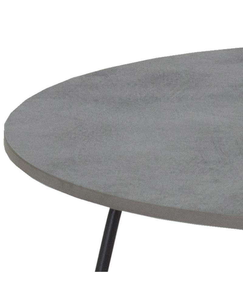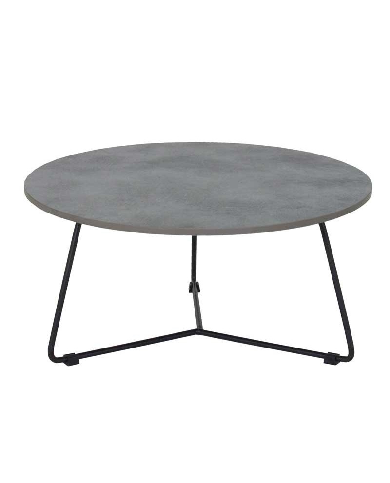 Table de salon ronde, piètement en métal laqué époxy noir, dessus en HPL rock gris clair