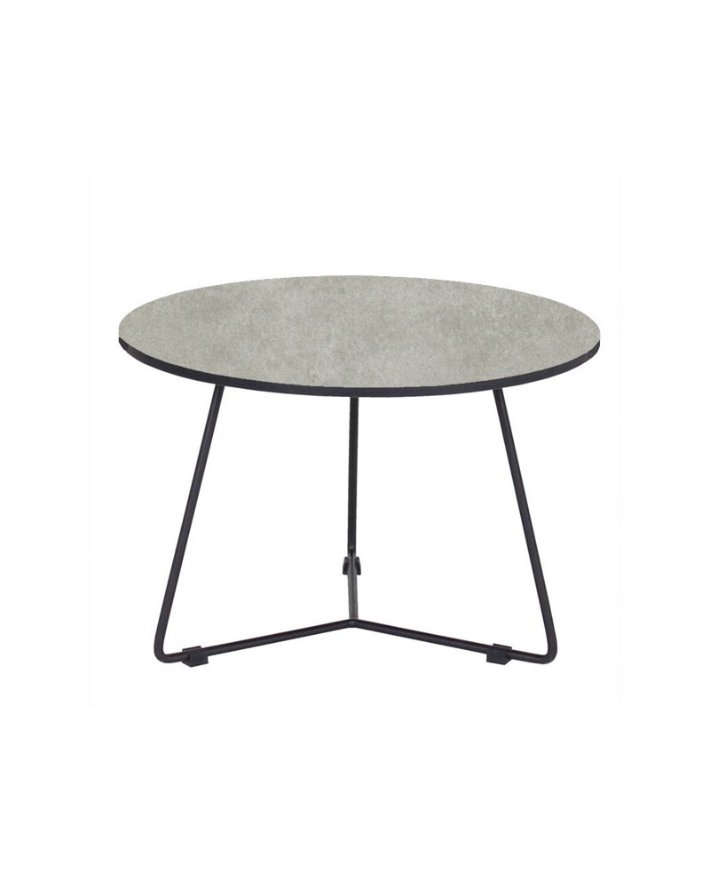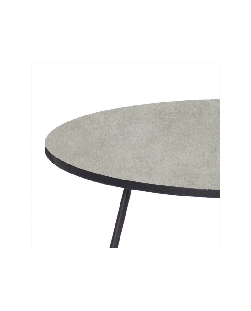 Table de salon ronde, piètement en métal laqué époxy noir, dessus en HPL vulcano gris clair.