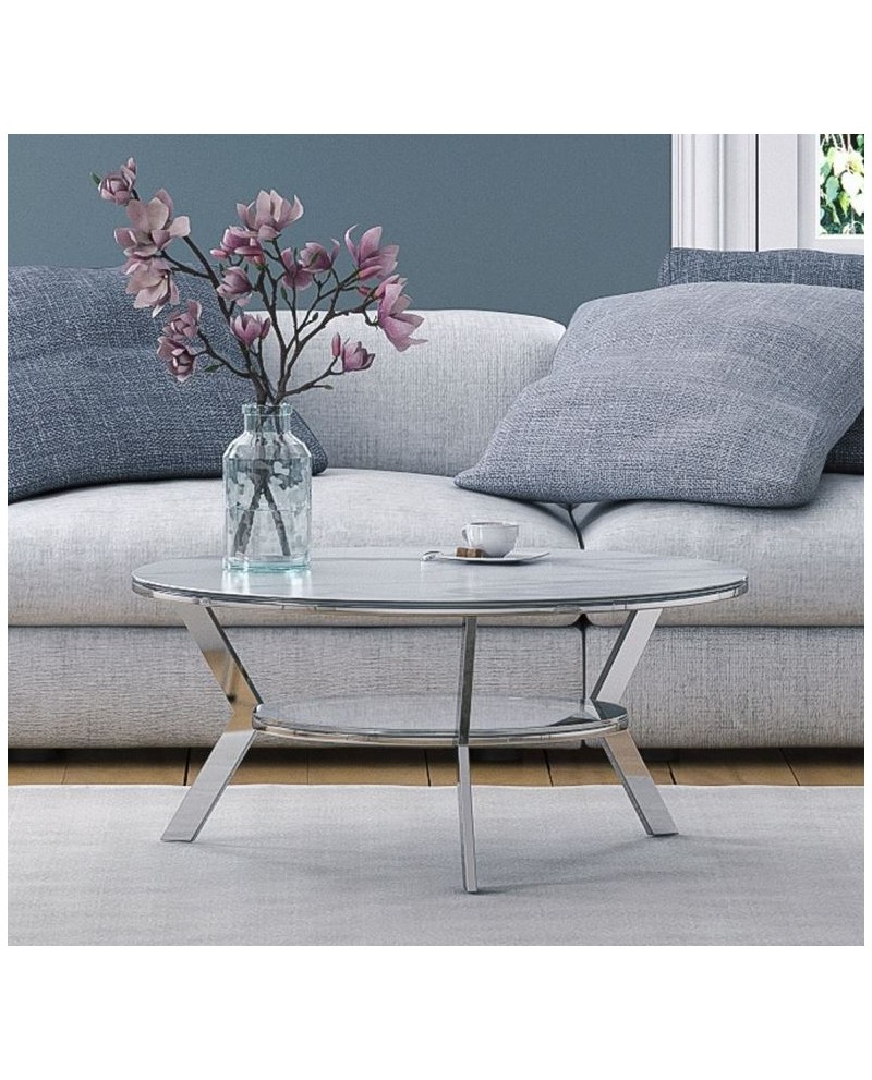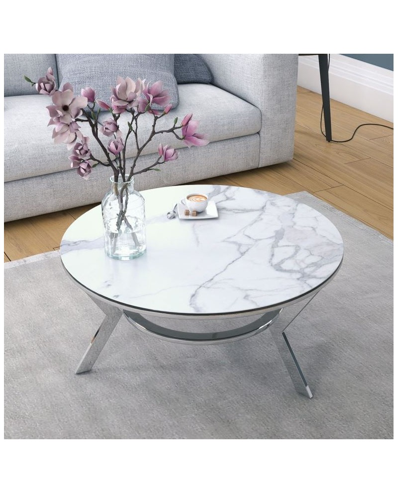 Table en céramique décor marbre + tablette en verre trempé, piètement acier inoxydable chromé.