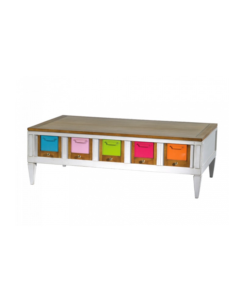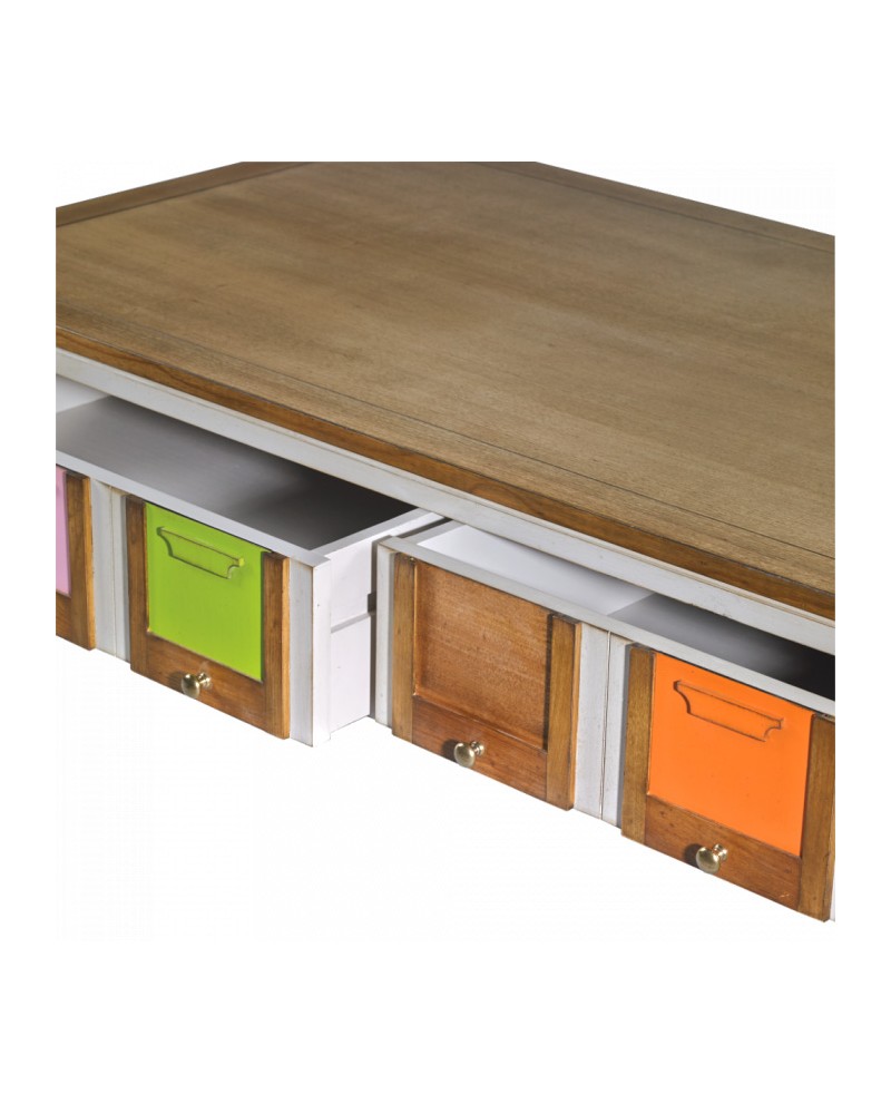 Table basse bois merisier massif et hêtre. Structure laqué blanc, décor portes photos laque multi-couleurs, plateau merisier délavé.
