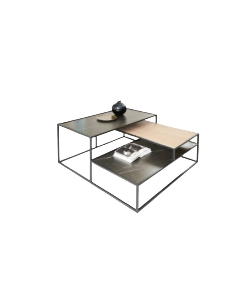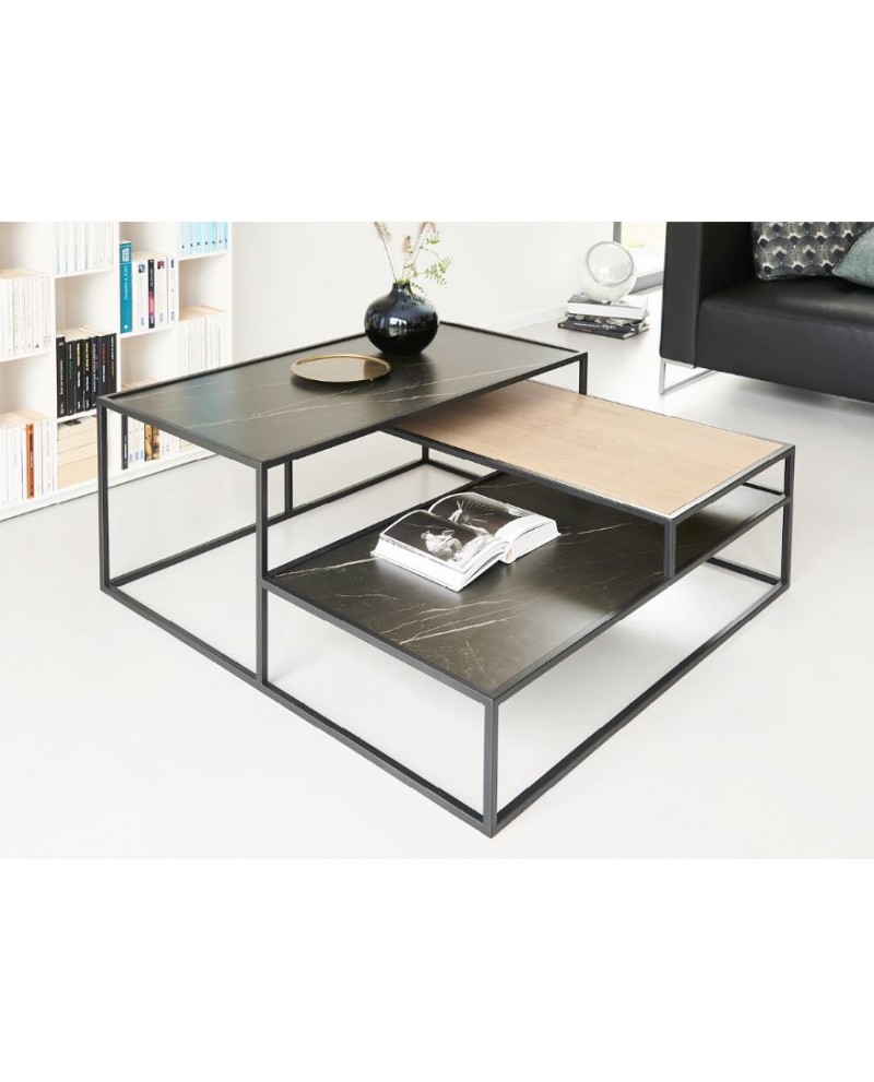 Table de salon MIKADO carrée dessus céramique pleine masse "Marbre Noir" et dessus placage chêne à nœuds relevable.