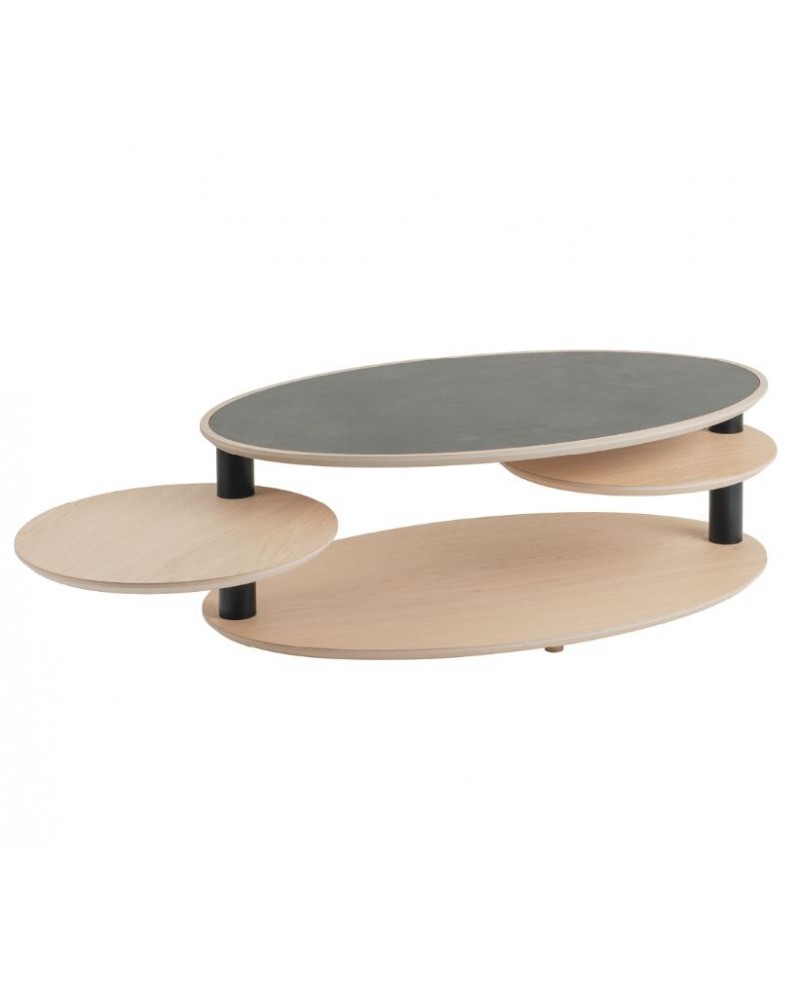 Table de salon MINERAL ovale dessus chêne et céramique "Vulcano Roca", 2 plateaux ronds annexes pivotants.