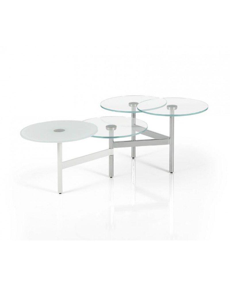 Table de salon NEIGE 3 verres ronds trempés, extra clair, 1 satellite verre trempé extra clair laqué blanc 10mm.