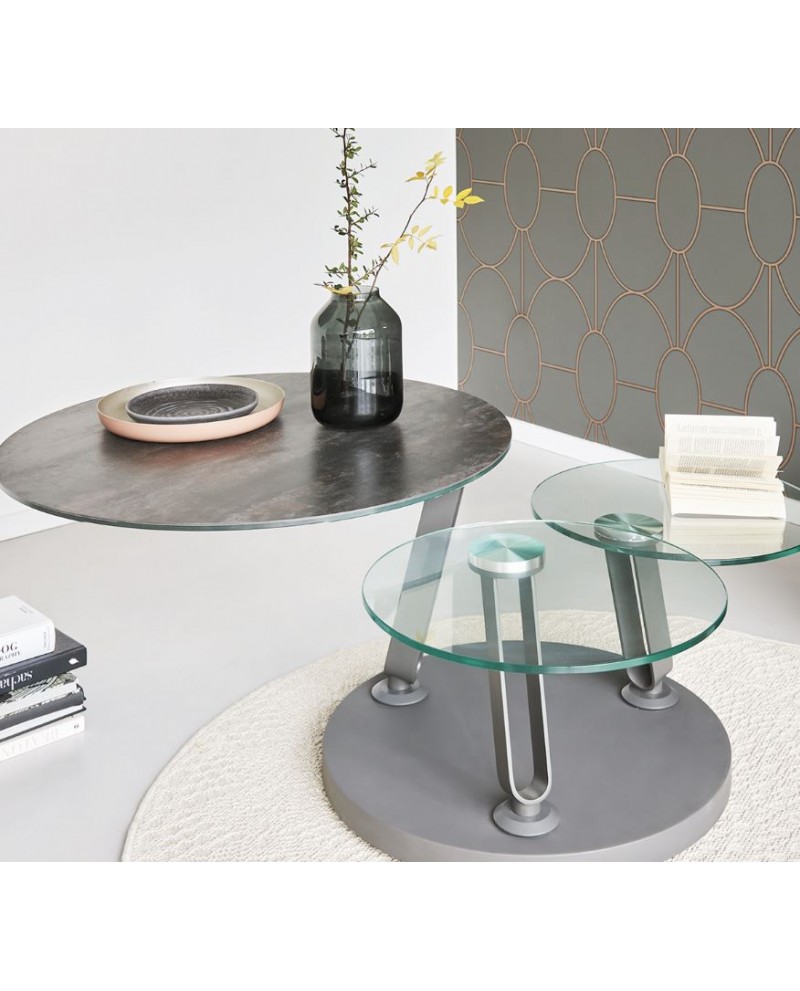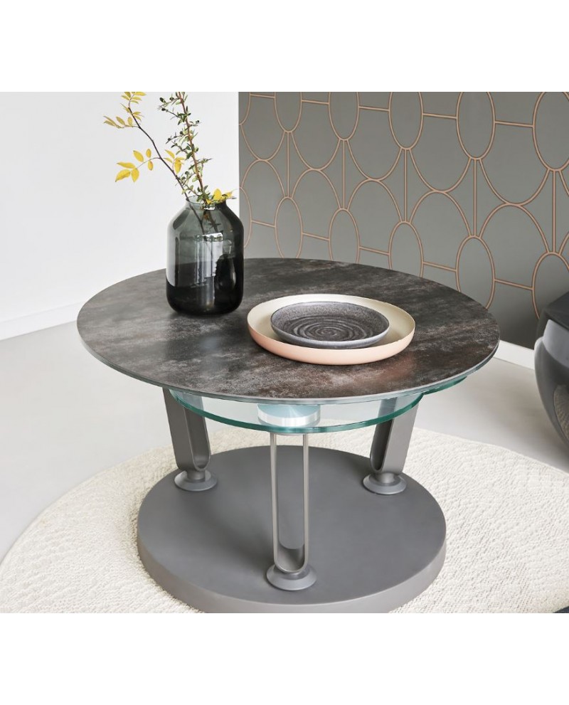 Table de salon NEPTUNE ronde dessus céramique "Basalt" pivotant verre trempé 10mm.