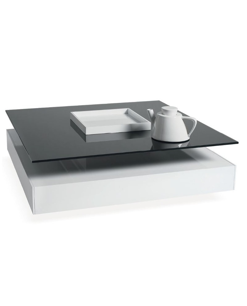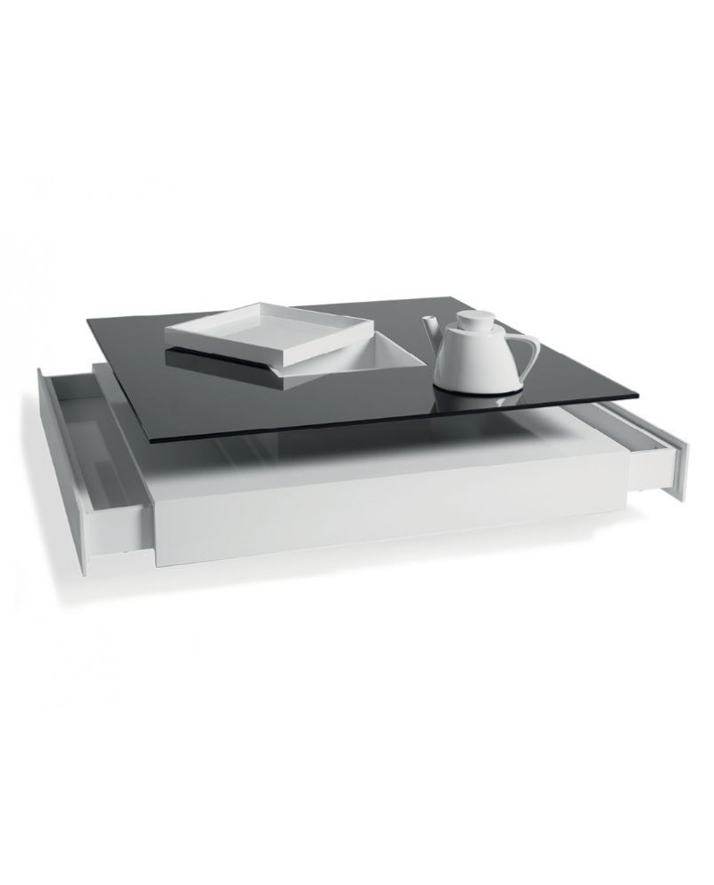 Table de salon SQUARE bar carré, dessus verre laqué 10mm, 1 plateau à servir, 2 tiroirs.