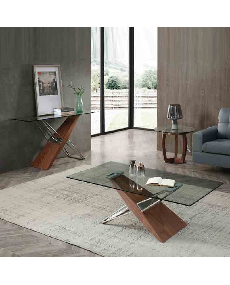 Base en hêtre plaqué noyer et inox poli miroir, dessus en verre trempé épaisseur 10mm