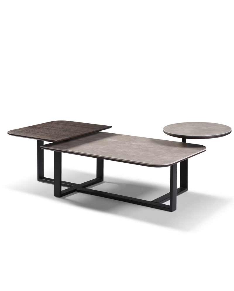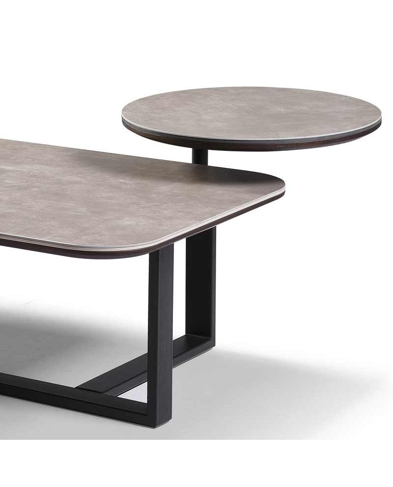 Socle en métal laqué époxy noir, dessus plateau pivotant en céramique taupe et plaquage chêne foncé sur panneaux de particules