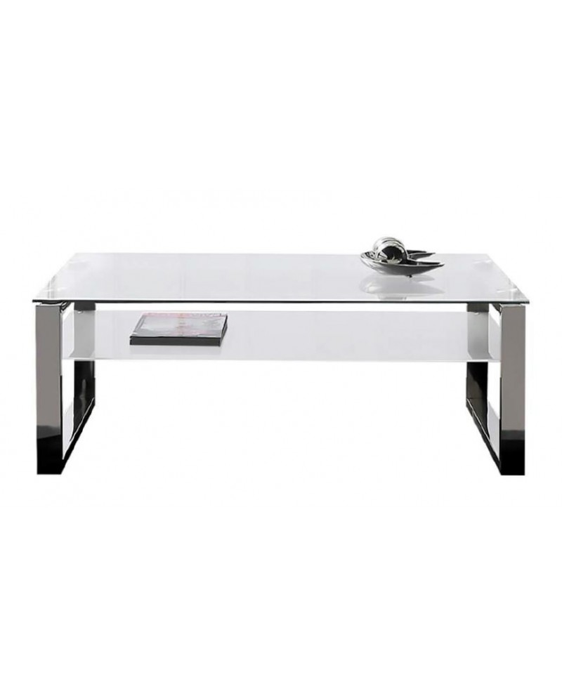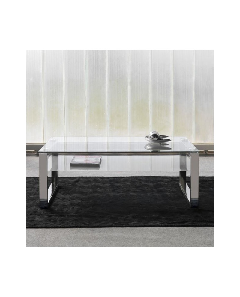 Table basse en verre trempé, structure en acier chromé, plateau du dessous opaque.