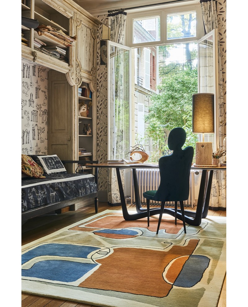 Les aquarelles de Vincent Darré ont été traduites avec leur subtilité de nuances grâce à une mise en teinture spéciale, issue de petits secrets de notre maître teinturier. L’inspiration des céramistes de Vallauris transpercent dans cette collection, où le brillant de l’émail est restitué par la soie végétale utilisée en simple ligne de contour. Coloris sages pour cette composition aux teintes chaudes et aux lignes anthropomorphes.