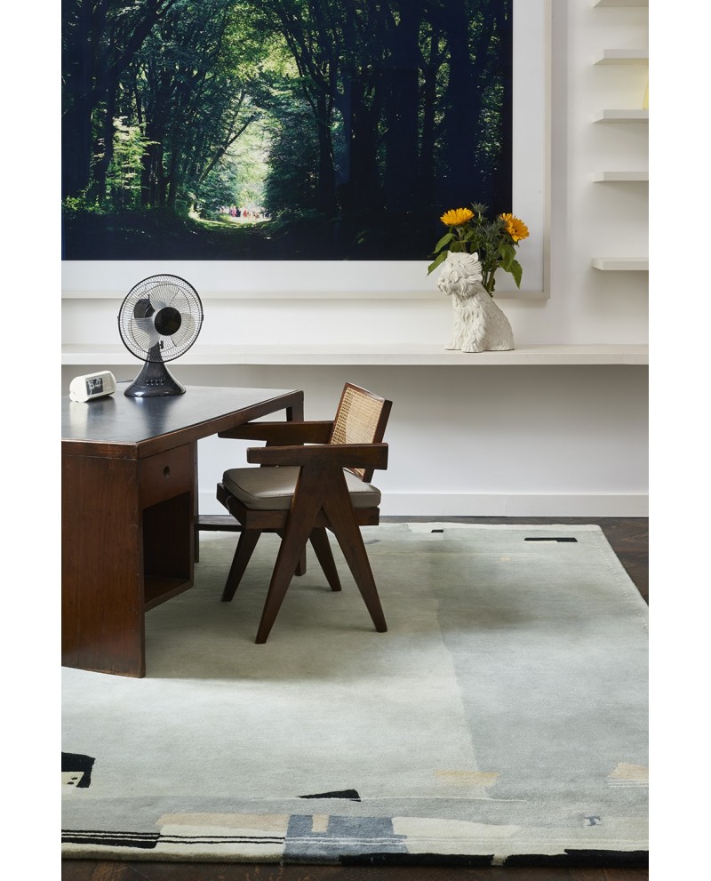 Toujours inspiré par les maîtres du tapis des années 20 Jean-Jacques Beaumé renoue ici avec les vibrations de gris, juste soulignées d’accent et de lignes vibrantes en demi teintes. De quoi accessoiriser son salon sur une musique Jazzy d’époque.