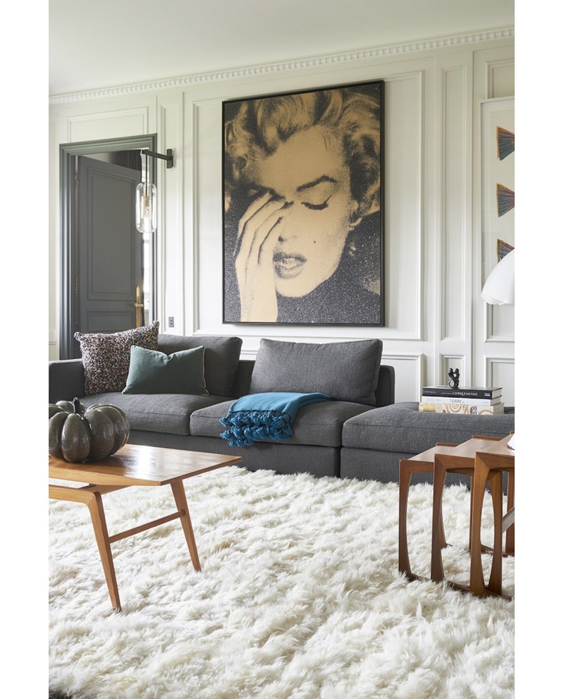 Ce tapis est composé de lanières de peau lainée tissées pour recomposer un velours irrégulier à la douceur incomparable. Véritable appel aux sens du toucher comme de la vue, cette qualité invite à la lascivité et à l’abandon.