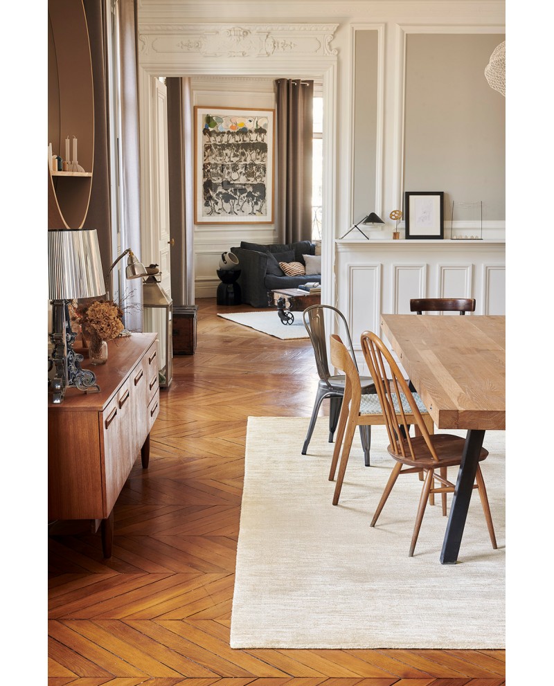 Le plus glamour des tapis de la collection, ce tapis tissé à la main en fibre de bananier séduit par sa luxuriance et la justesse de ses déclinaisons chromatiques. Jouant sur des tonalités neutres, il s’intègrera aux décors les plus sophistiqués. Cet uni sera parfait dans un univers haussmannien épuré comme dans une décoration plus ornemaniste pour apporter lumière et matière. Développé en très grandes tailles, il permet de créer un espace confortable pour des séjours d’exception.