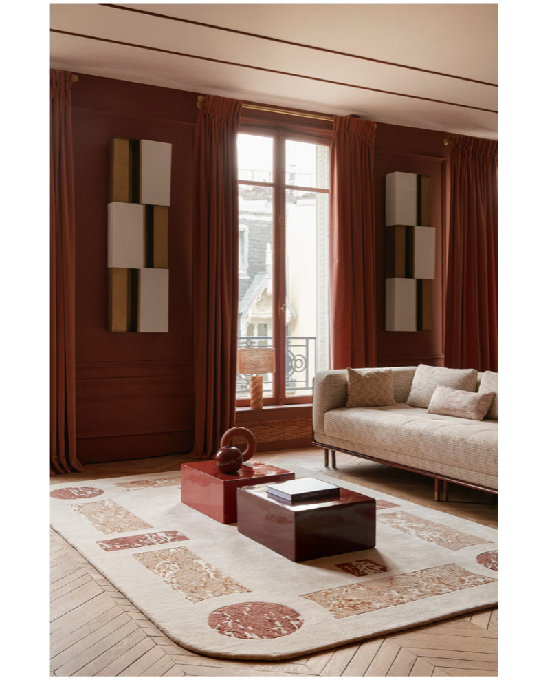 Avec Paladio, Anne-Sophie Pailleret revisite l’élégance des sols en marqueterie de pierre des villas historiques méditerranéennes, comme la Villa Kérylos. Le tapis s’impose comme un trompe-l’œil raffiné, où les nuances imitent le grain et la profondeur du marbre. Réalisé en tuft main avec un jeu subtil de boucles et de velours, Paladio témoigne d’un savoir-faire d’exception. Une pièce sculpturale au charme intemporel.