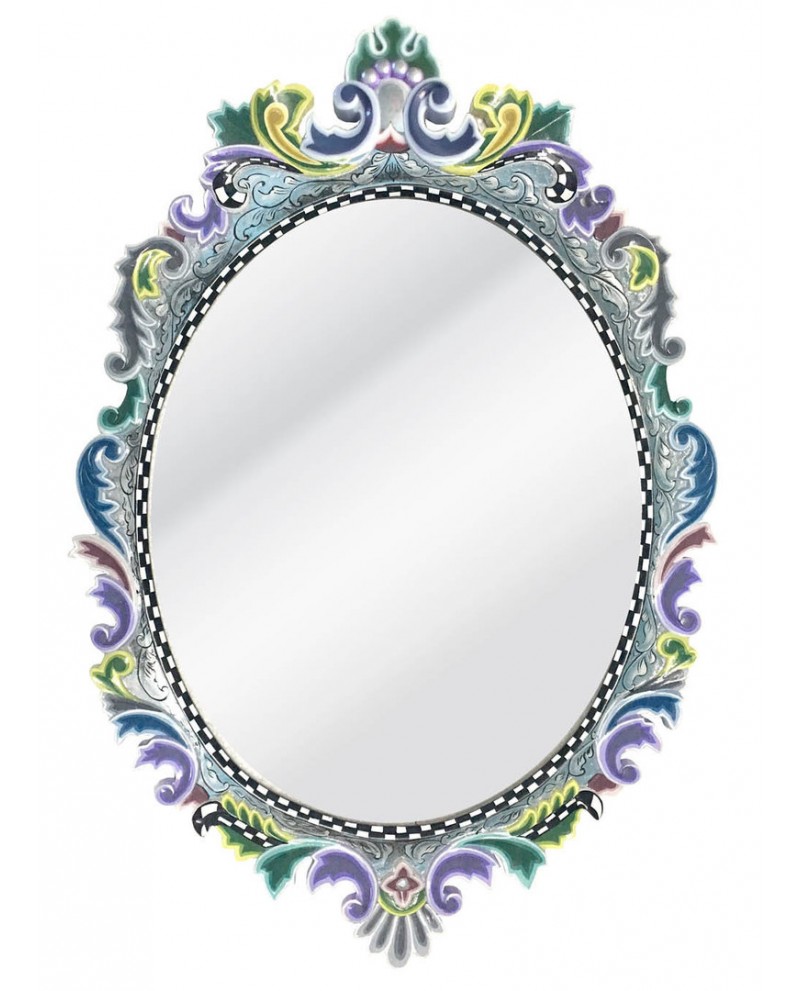 Le miroir ovale Versailles Silver Line est minutieusement décoré avec sa corniche aux tonalités fraiches et argentées. Il est orné de motifs baroques ainsi que du damier noir et blanc signature de l'artiste. Il habillera avec élégance votre intérieur.