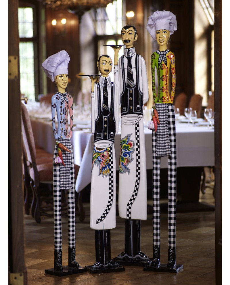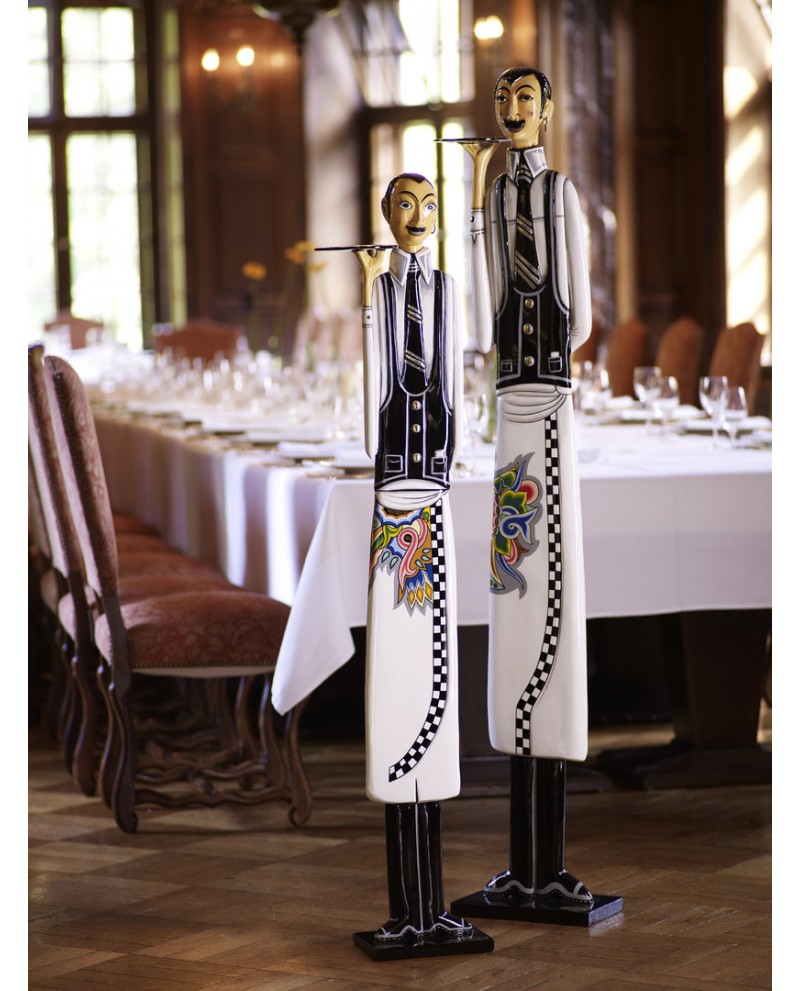 Gilet, cravate, pantalon et chaussures en noir, bienvenue au garçon de café des restaurants brasseries, de belles sculptures de serveurs signées Tom’s Drag vous accueillent avec originalité.