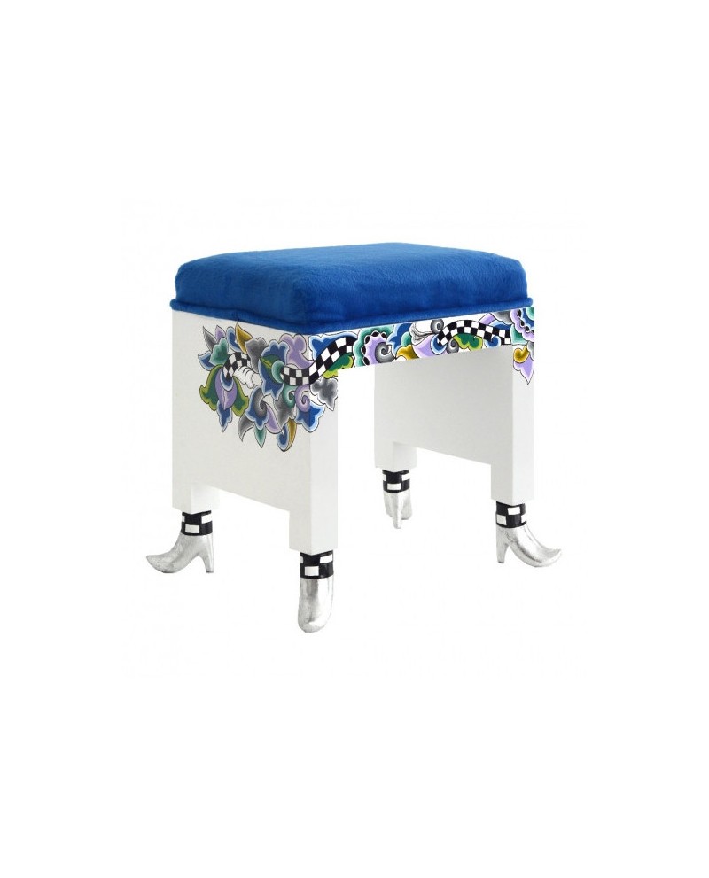 Le tabouret SILVER LINE avec son assise en velours bleu, en bois et peint à la main. fait partie de la collection Silver-Line des Tom's Drag.