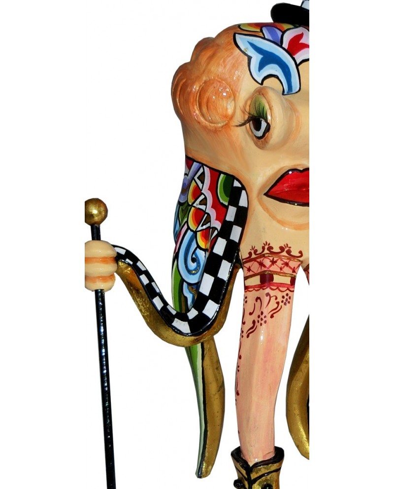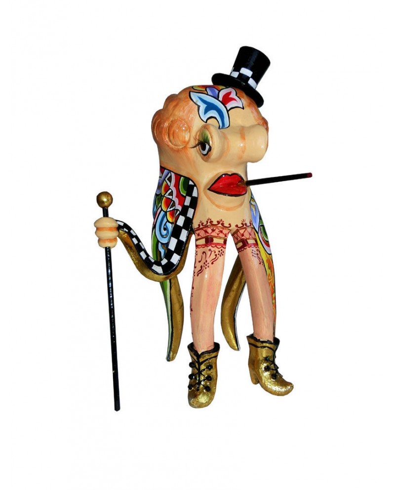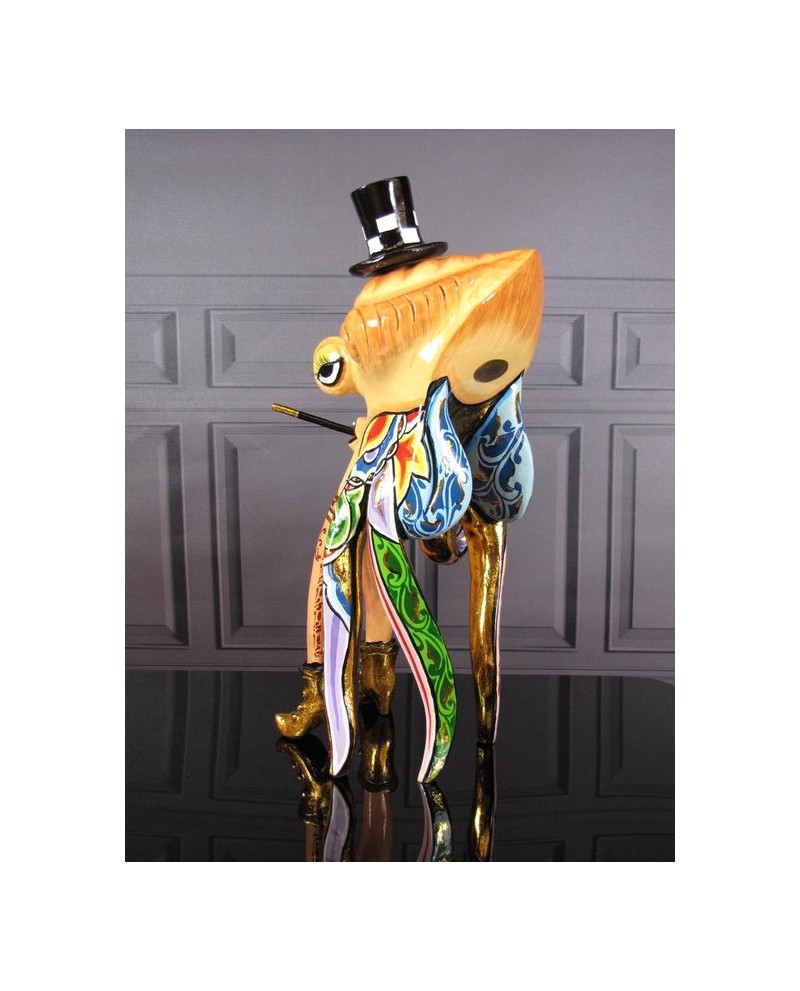 On craque devant le charme irrésistible de La pieuvre Lady Marlène à l'allure distinguée. Ces tentacules multicolores sont également décorées du damier noir et blanc ainsi que son chapeau signature de l'artiste. Elle est chaussée de bottines dorées assorties aux accessoires délicatement choisis, on apprécie la subtilité des détails.