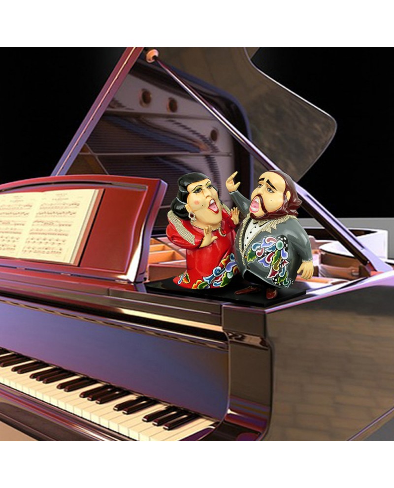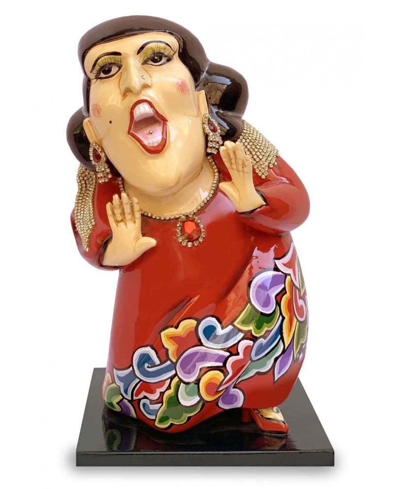 Cette statuette à son effigie est en plein mouvement, presque réelle, on pourrait l'entendre chanter ! Elle est vêtue d'une somptueuse robe rouge assortie aux escarpins aux motifs colorés et parée de bijoux.