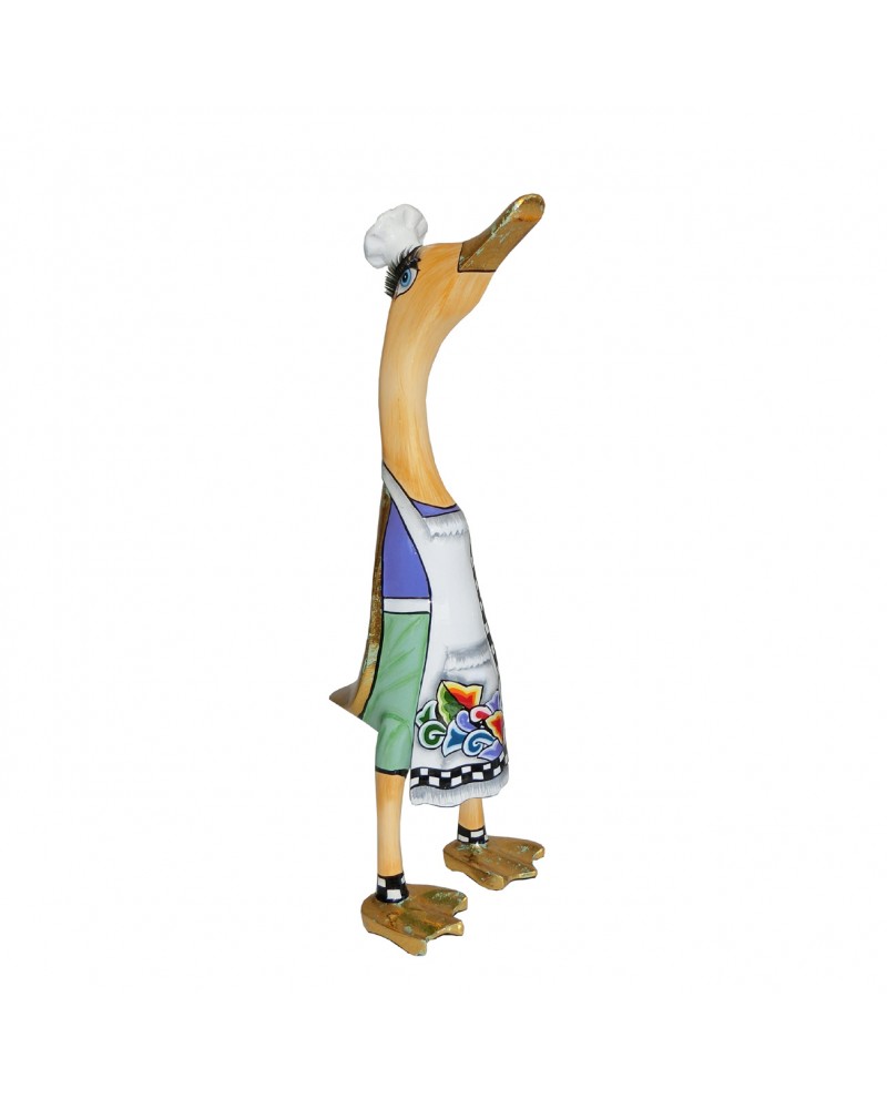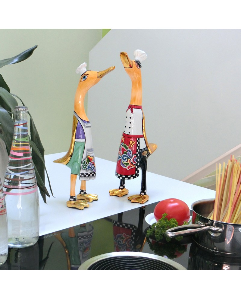 Aline, la cane, est en tenue de cuisinière, elle porte une toque blanche et un joli tablier blanc décoré de motifs colorés et du célèbre damier noir et blanc signature de l'artiste. Sa posture droite, son maquillage et ses pattes palmées dorées lui donnent de la prestance et de l'élégance !