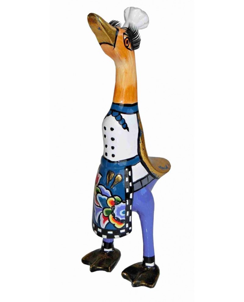 Alain, le canard, est en tenue de cuisinier, il porte une toque blanche et un tablier rouge décoré de motifs colorés et du célèbre damier noir et blanc signature de l'artiste. Elégant par sa posture droite, il est prêt à vous servir !