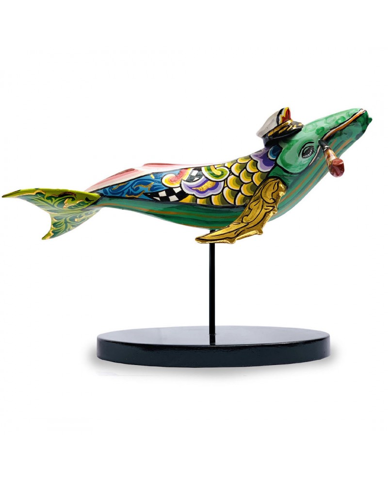 Ahab est une baleine posée sur un socle. Elle est décorée de motifs aux couleurs chaleureuses et elle porte un chapeau de capitaine en mémoire du "Capitaine Achab". Elle saura nous attendrir avec sa pipe au coin du bec et son allure détendue.