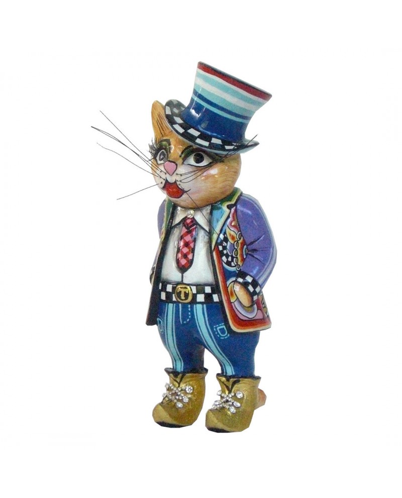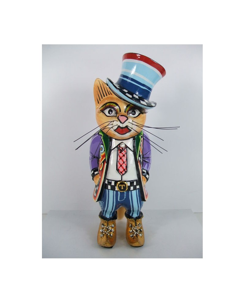 Paul, un chat élégant de part sa tenue ! Il est vêtu d'un costume, avec cravate, chemise blanche, pantalons et d'un chapeau haut de forme aux tonalités bleues. Sa veste multicolore est décorée des célèbres motifs et sa ceinture est siglée "T" pour Tom's et signée du fameux damier noir et blanc !