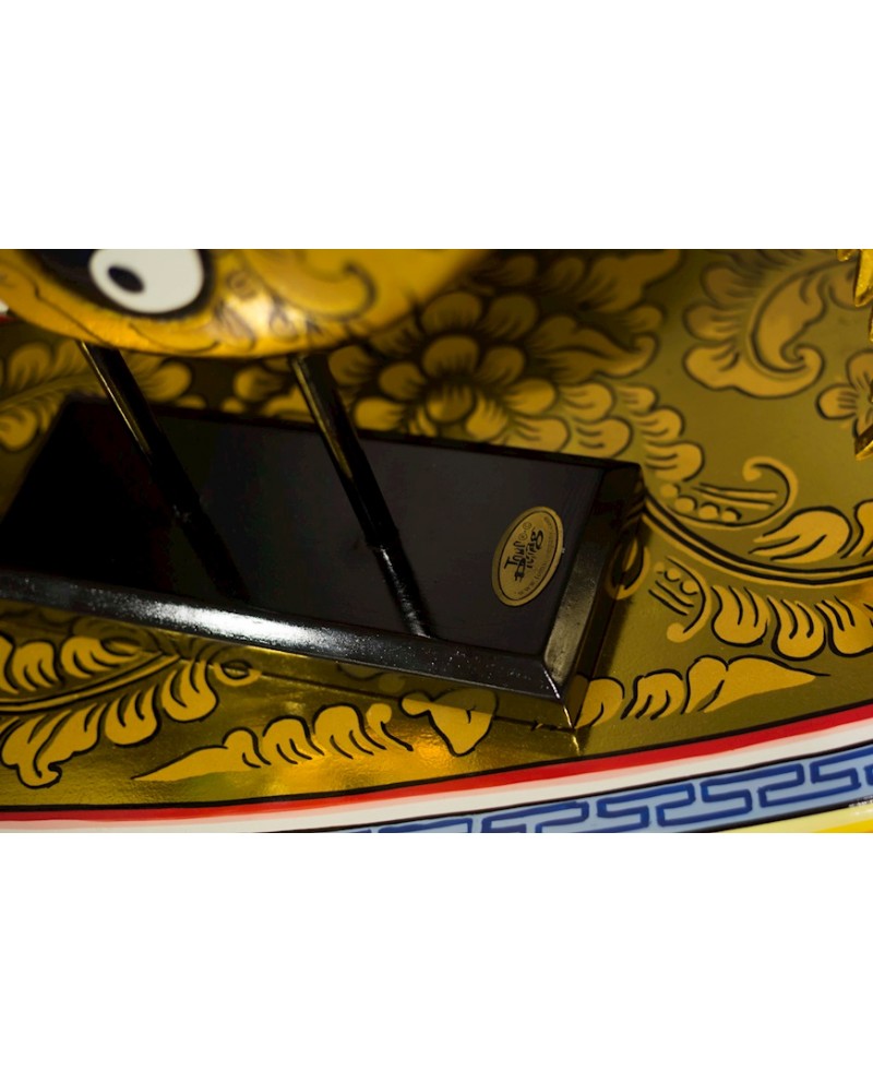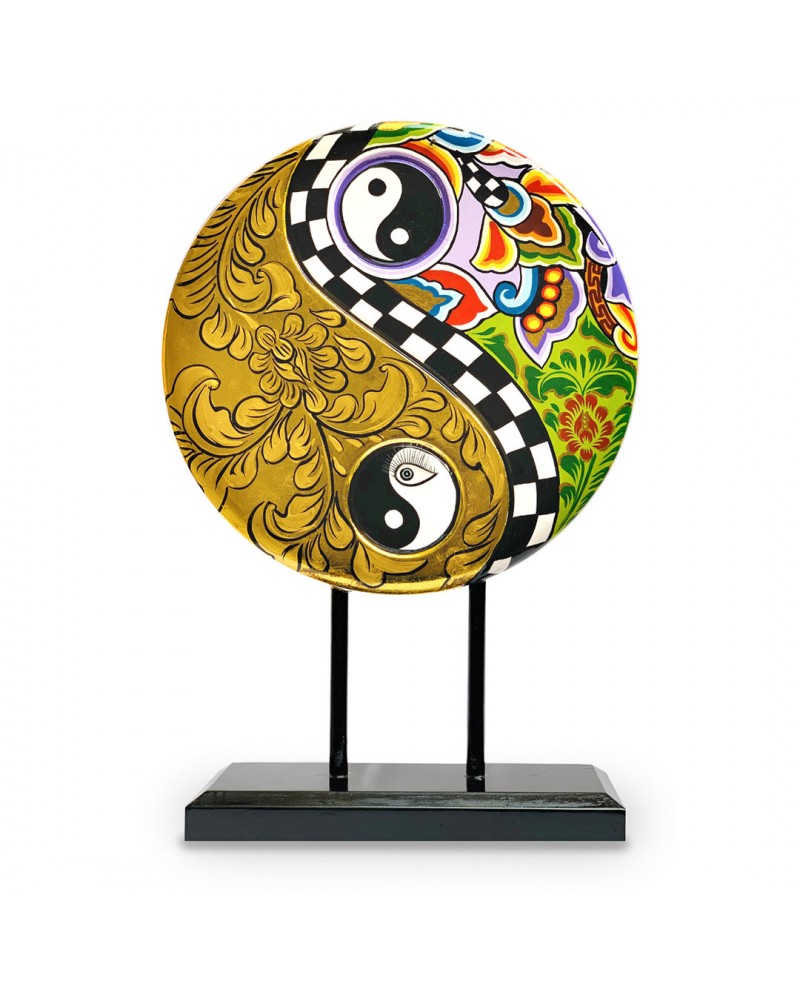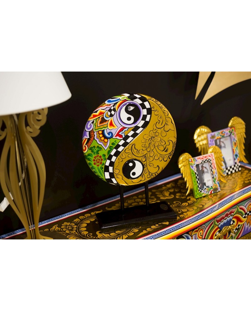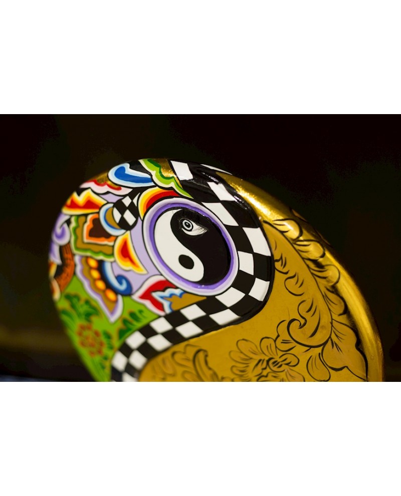 Cet accessoire est décoré avec une partie dorée au style baroque et l'autre aux motifs célèbres des Tom's avec des couleurs vives et chatoyantes ! On retrouve au milieu le damier noir et blanc, signature de l'artiste qui fait également référence aux couleurs du YIN-YANG.