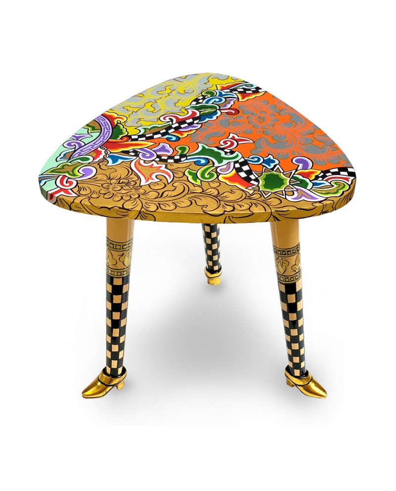 La table de salon Tabea aux tonalités vives, dorées et argentées est ornée des célèbres motifs des Tom's Drag.