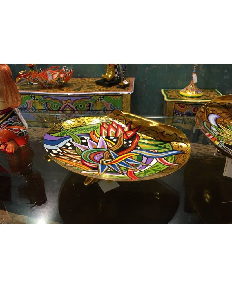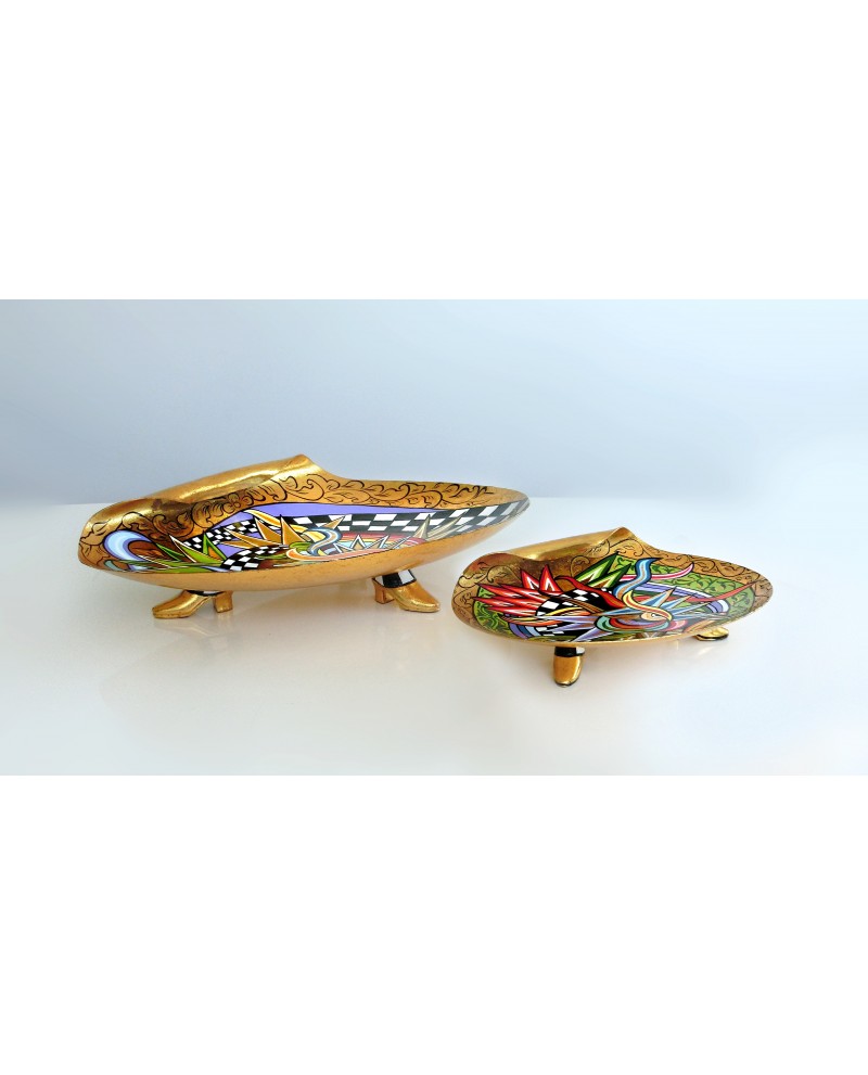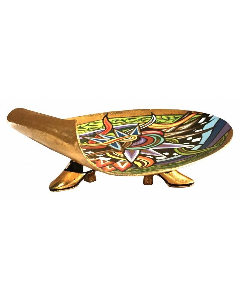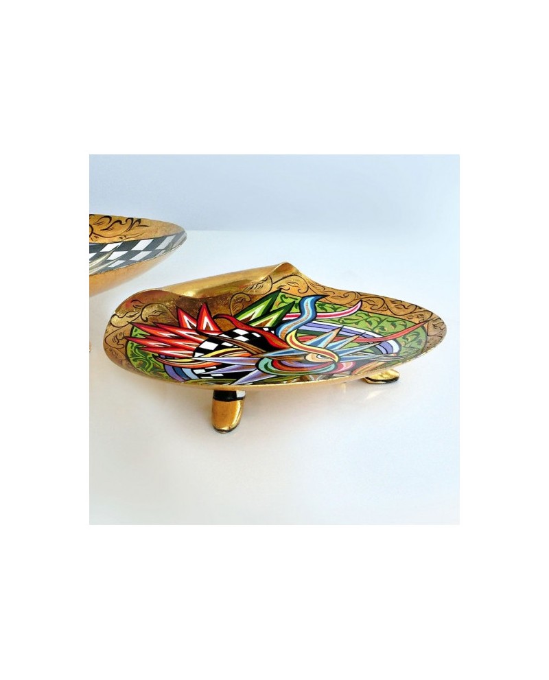 La coupe Sunrays est déposée délicatement sur 2 chaussures dorées. La richesse de ces motifs aux couleurs vives donne une illusion d'optique. Dorée à l'extérieur et colorée à l'intérieur, on retrouve le célèbre damier noir et blanc signature de l'artiste.