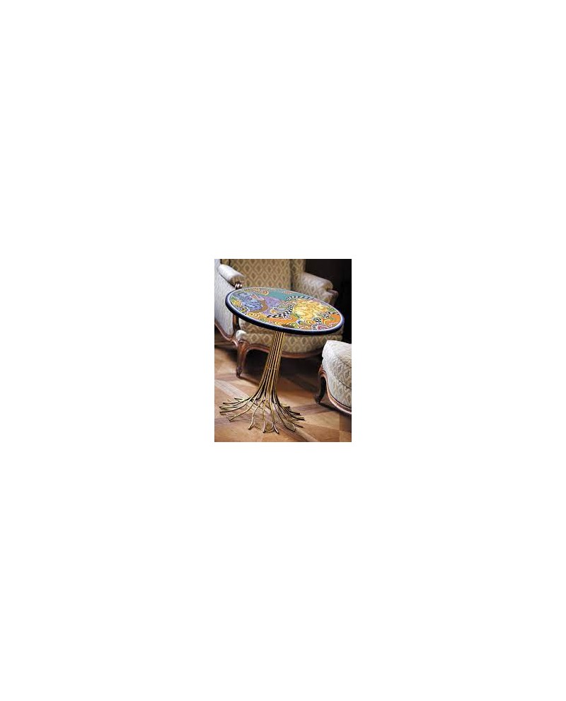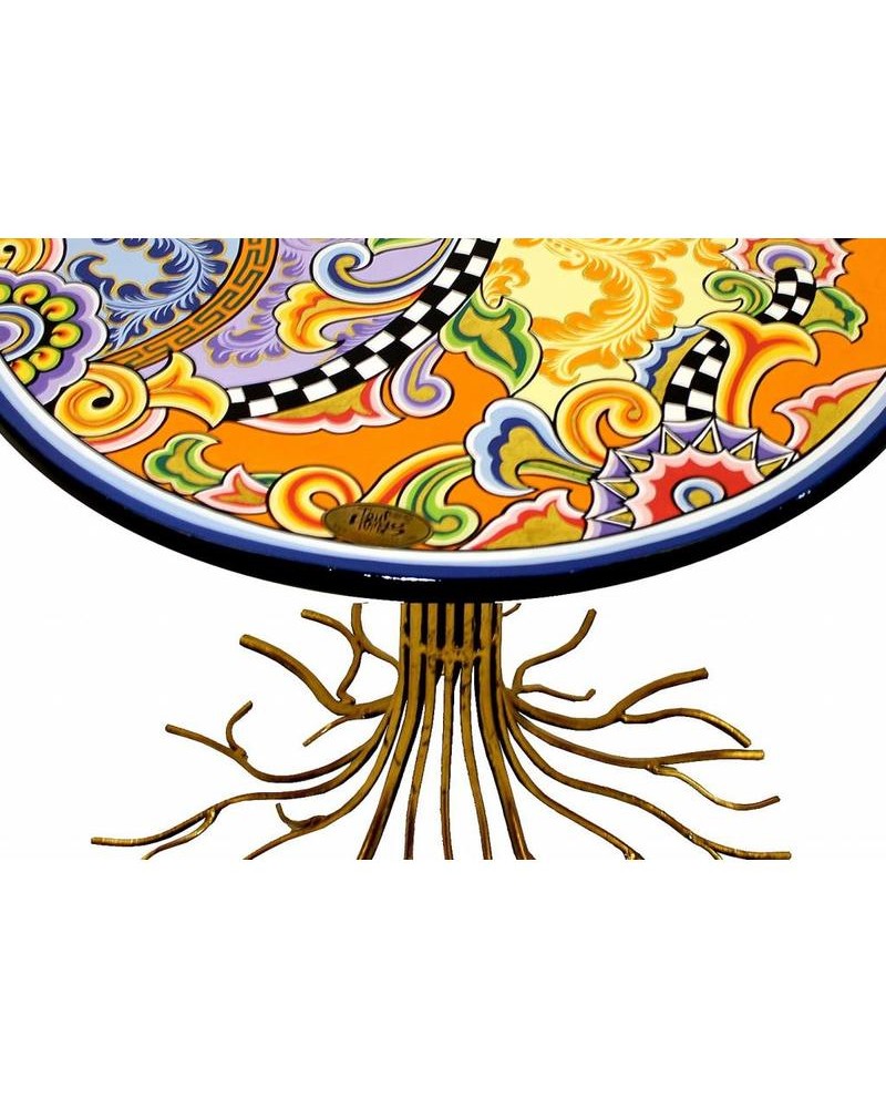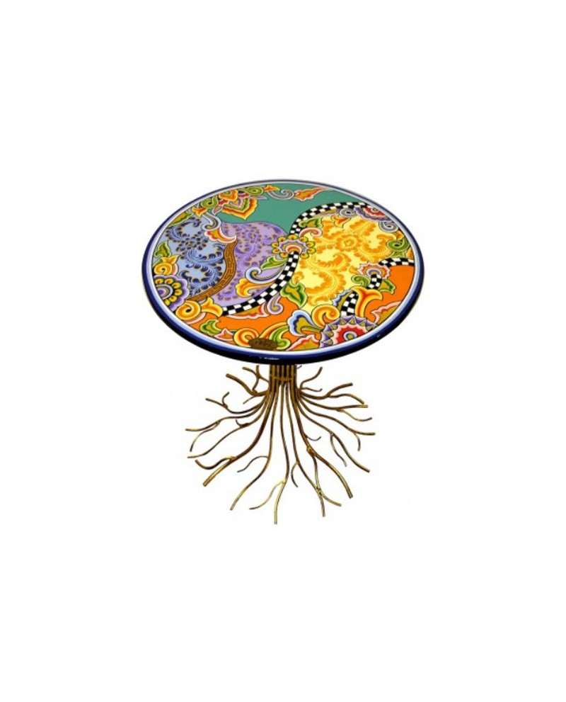 La table ronde Malaga entièrement peinte à la main est décorée des célèbres motifs des Tom's Drag aux couleurs chaleureuses.