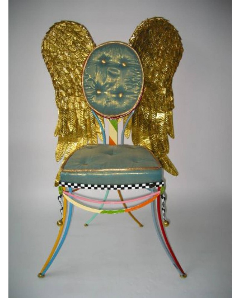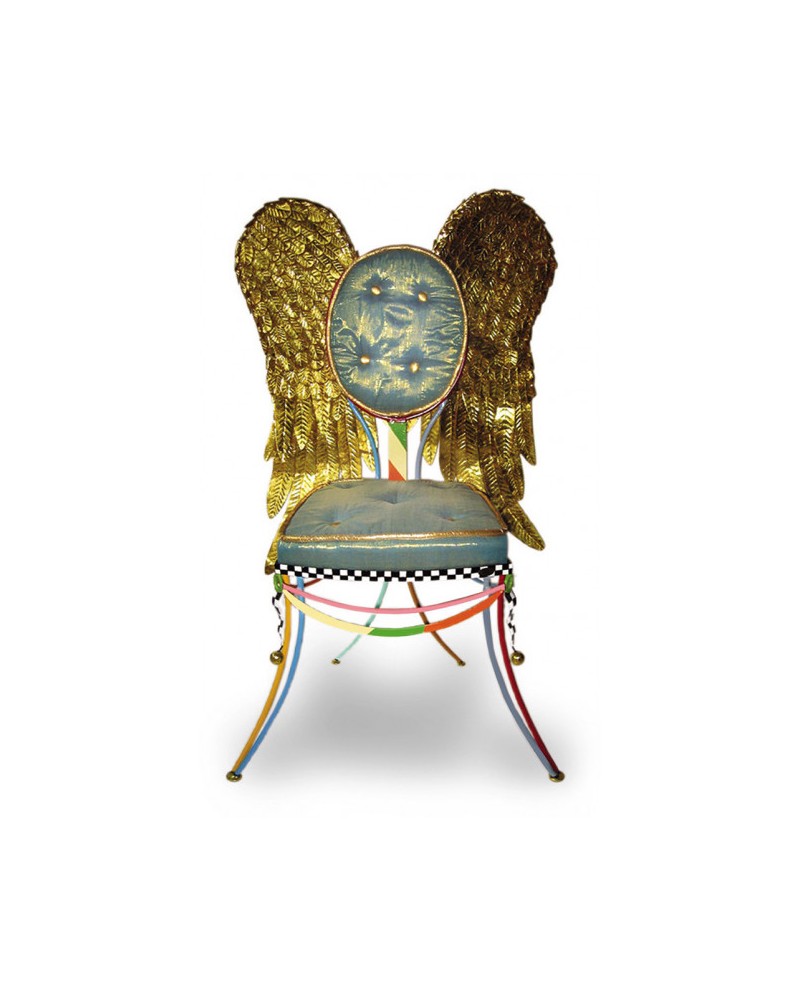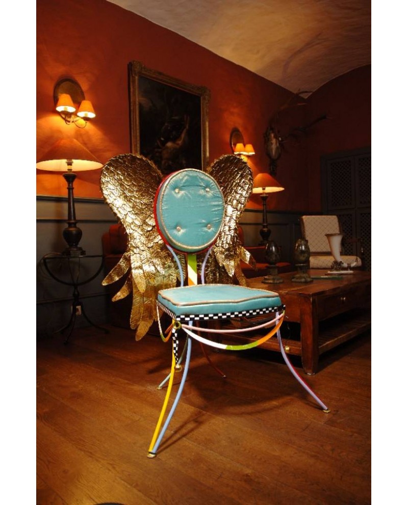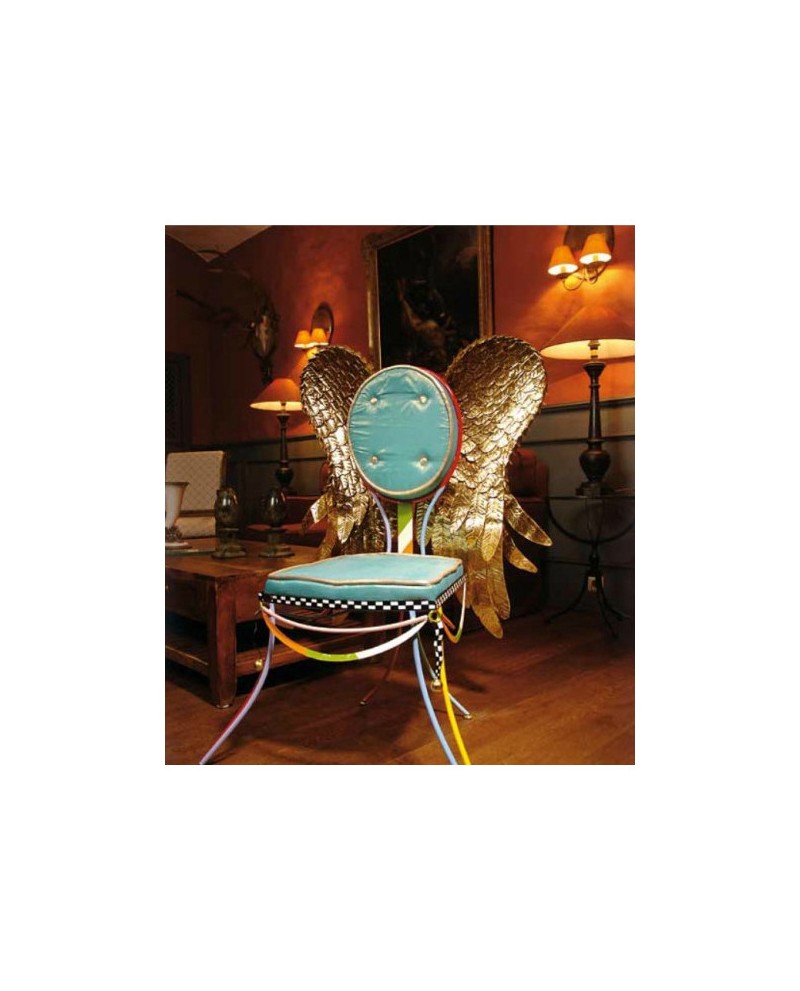 Complètement décalée, la chaise Angel nous interpelle par son dossier orné de deux ailes aux reflets or tel un trône aux portes du Paradis.