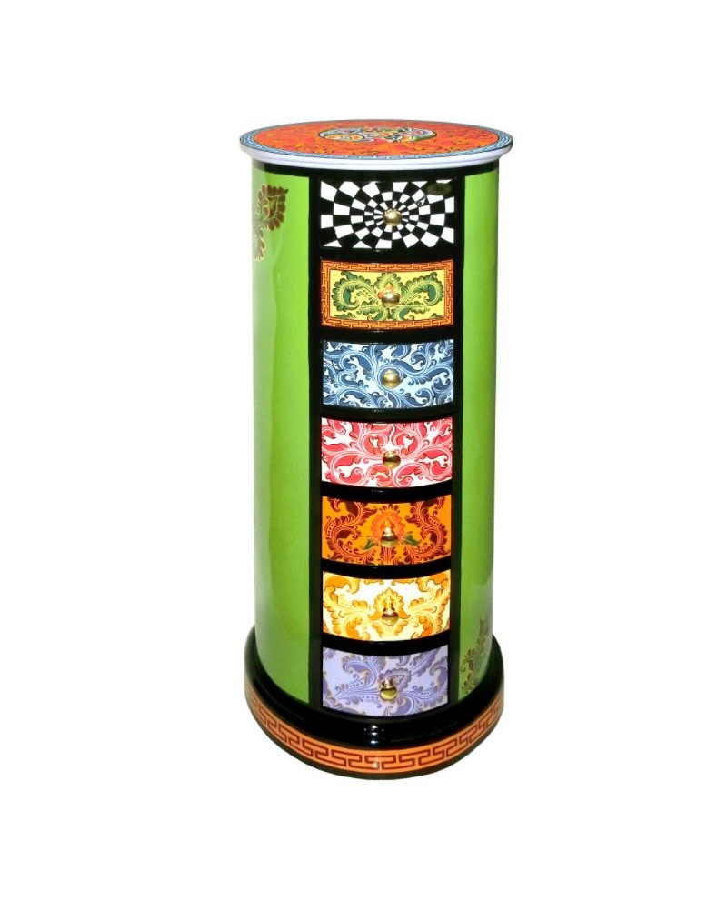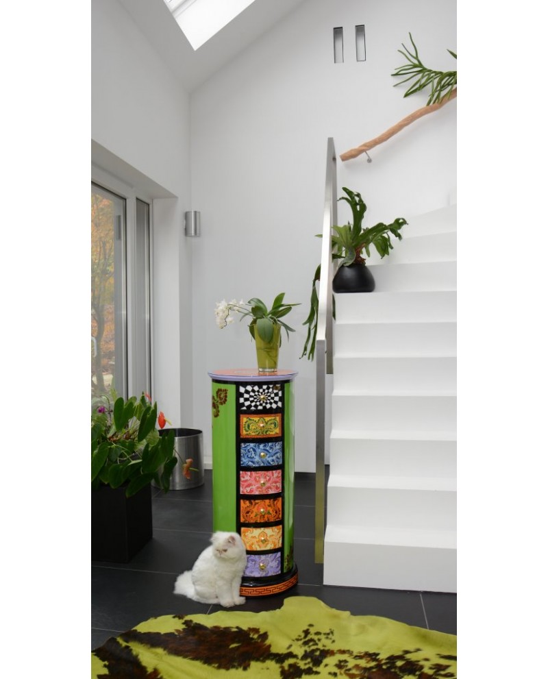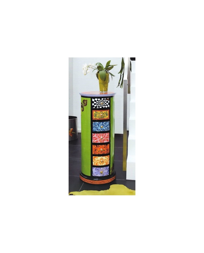 Originale par la richesse de ces motifs et de ces couleurs éclatantes, cette commode semainier cylindrique en bois et peinte à la main est fonctionnelle avec ces 7 tiroirs.