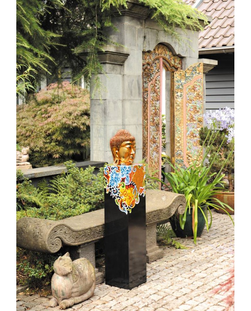 La tête de Bouddha présentée sur son socle est sculptée dans un mélange de résine et de poudre de marbre le "marmorin" et a été peinte à la main en couleur or.