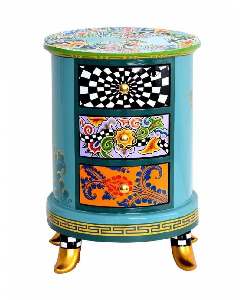 La commode ou chevet ronde bleue 3 tiroirs, en bois et peinte à la main, fait partie de la collection des Tom's Drag.