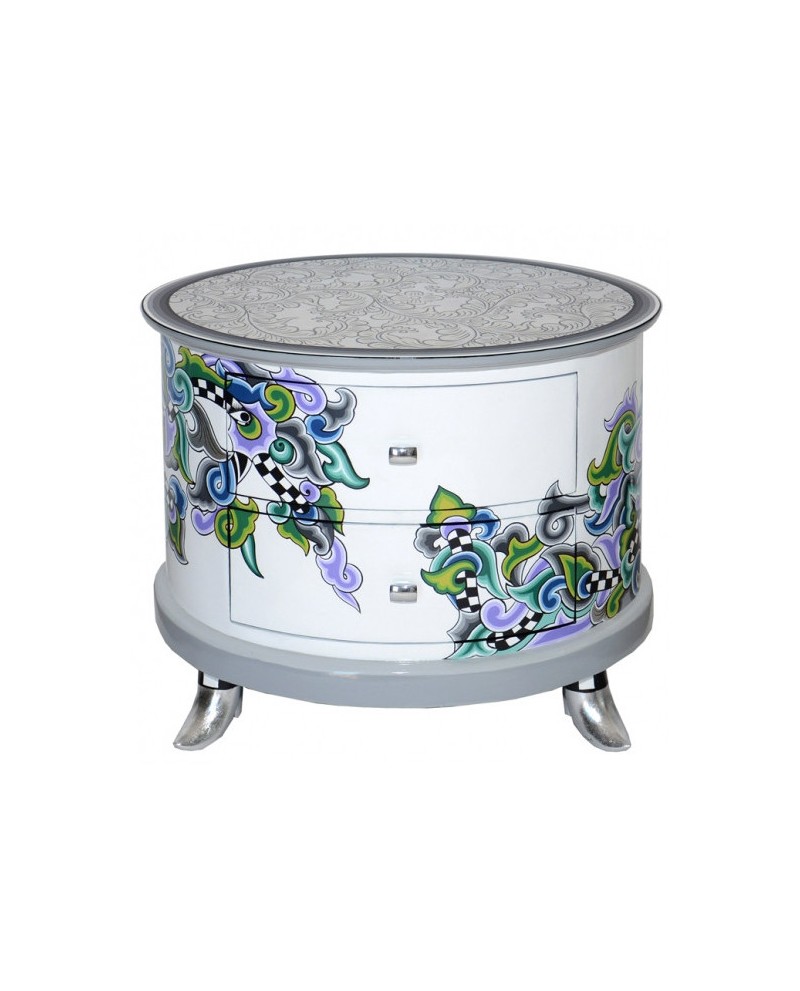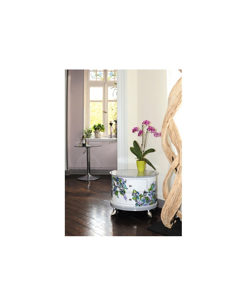 La commode ovale Ronda ou chevet 2 tiroirs, en bois et peinte à la main, fait partie de la collection Silver Line des Tom's Drag.