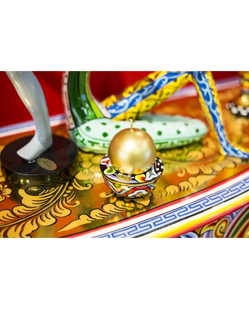 Comme tous les objets de la collection Tom’s Drag, ces sculptures rayonnent de multiples couleurs et dorures qui leur donnent vie.
