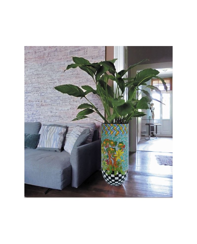 Ce cache-pot reprend le thème de la jungle avec ses couleurs verdoyantes. On y retrouve également le célèbre damier noir et blanc signature de l'artiste qui apporte un contraste dans les couleurs.