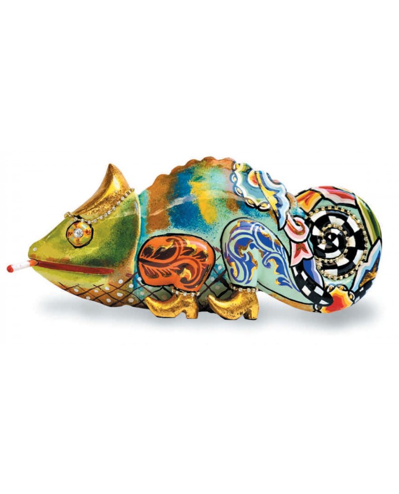 Le caméléon Camilla avec sa cigarette au coin du bec est très élégant, orné de strass il parait de lumière. Ses couleurs lui confèrent un look extravagant !